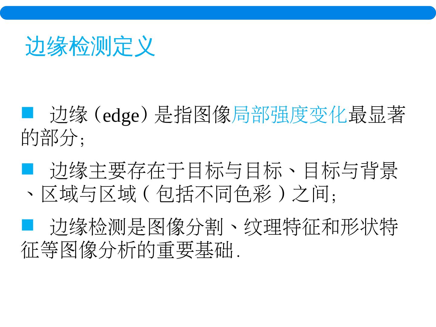 5 . 边缘( edge ) 是指图像 局部强度变化 最显著的部分; 边缘主要存在于目标与目标、目标与背景、区域与区域(包括不同色彩)之间; 边缘检测是图像分割、纹理特征和形状特征等图像分析的重要基础. 边缘检测定义