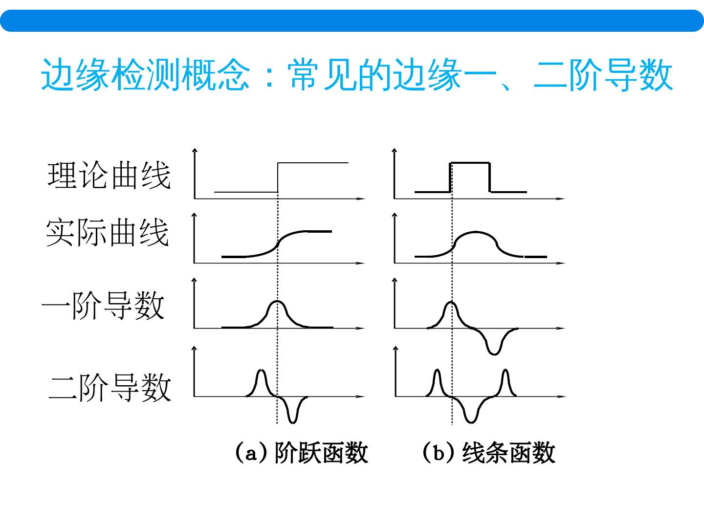 7 . ( a) 阶跃函数 ( b) 线条函数 理论曲线 实际曲线 边缘检测概念:常见的边缘一、二阶导数 一阶导数 二阶导数
