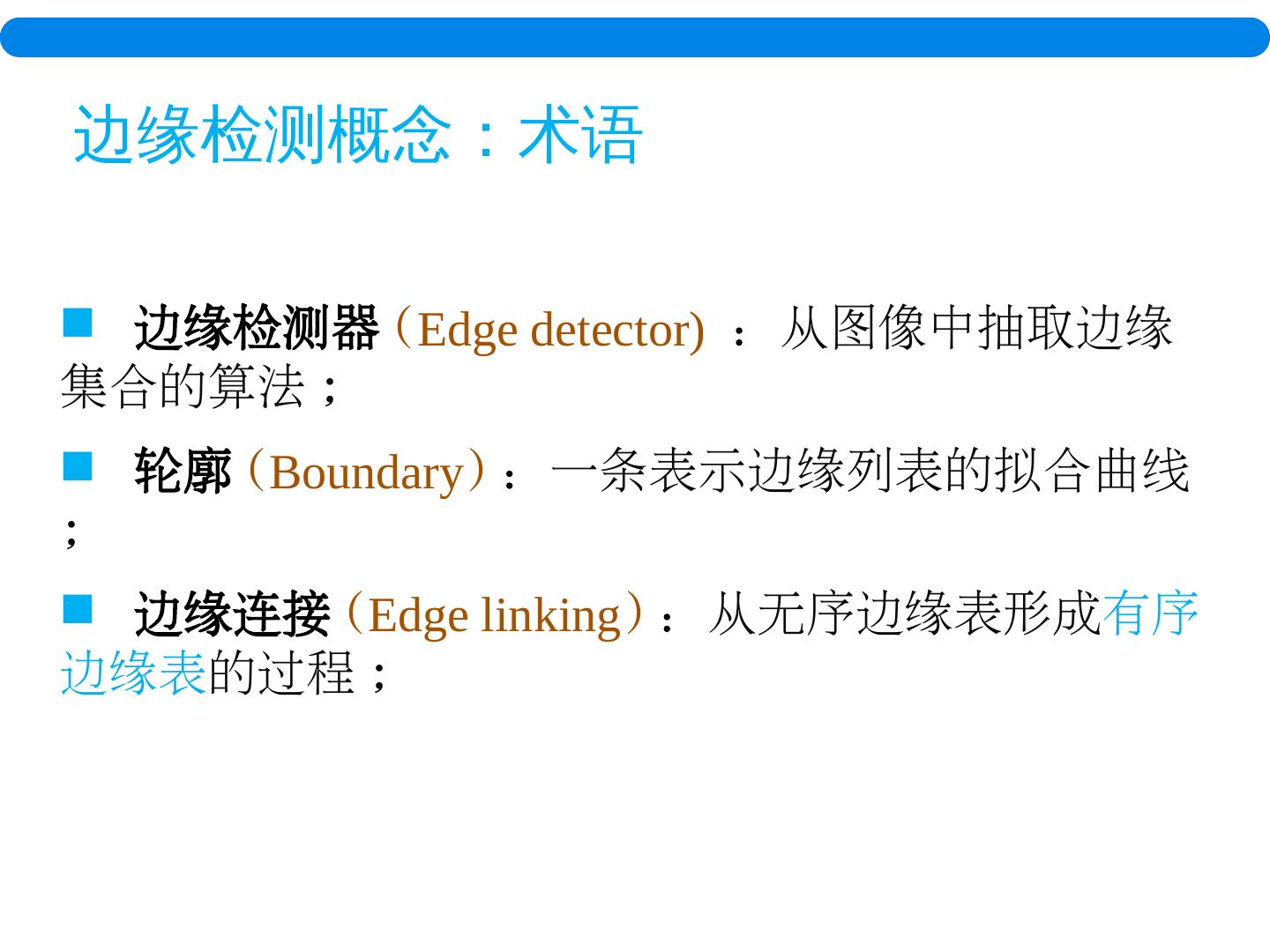 8 . 边缘检测器 ( Edge detector) : 从图像中抽取边缘集合的算法 ; 轮廓 ( Boundary ) : 一条表示边缘列表 的拟合曲线 ; 边缘连接 ( Edge linking ) : 从无序边缘表形成 有序边缘表 的过程 ; 边缘检测概念:术语