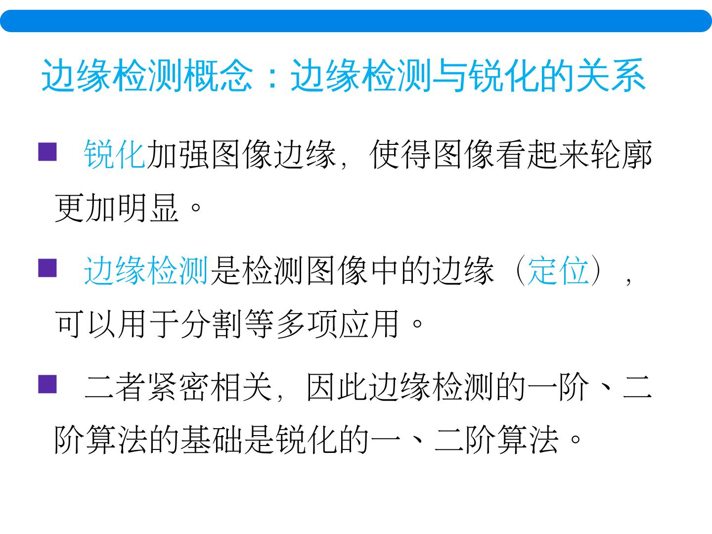 9 . 边缘检测概念:边缘检测与锐化的关系 锐化 加强 图像 边缘, 使得图像 看起来轮廓更加明显。 边缘检测 是检测图像中的 边缘( 定位 ), 可以用于分割等多项应用。 二者紧密相关,因此边缘检测的一 阶、二 阶 算法的基础是锐化的一、二阶算法。