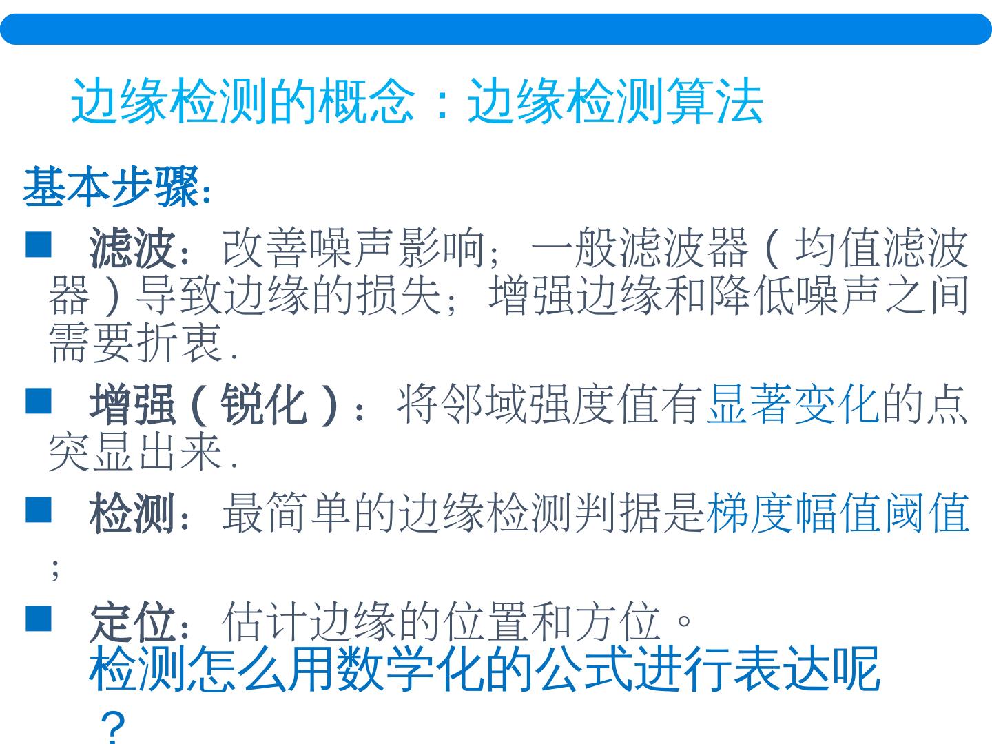 10 .基本步骤: 滤波: 改善噪声影响;一般滤波器 ( 均值滤波器 ) 导致边缘的损失;增强边缘和降低噪声之间需要折衷. 增强 ( 锐化 ) : 将邻域强度值有 显著变化 的点突显出来. 检测: 最简单的边缘检测判据是 梯度幅值阈值 ; 定位: 估计边缘的位置和方位。 边缘检测的概念:边缘检测算法 检测怎么用数学化的公式进行表达呢 ?