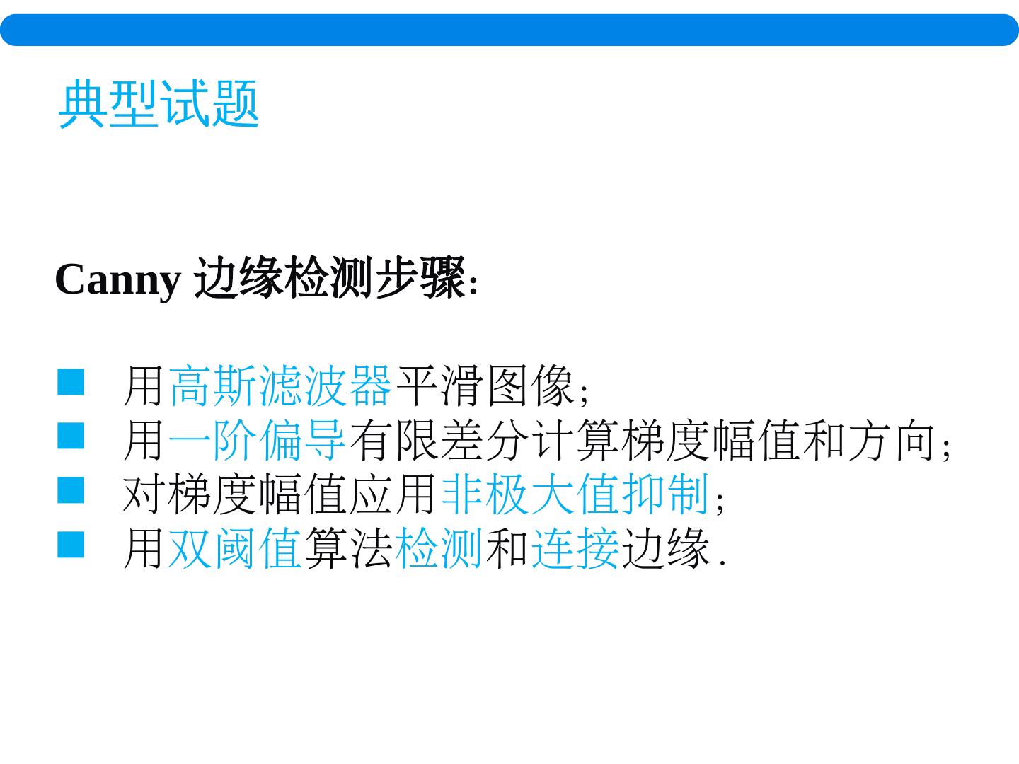 3 . 典型试题 Canny 边缘检测步骤: 用 高斯滤波器 平滑 图像; 用 一阶偏导 有限差分计算梯度幅值和 方向; 对 梯度幅值应用 非极大值 抑制 ; 用 双阈值 算法 检测 和 连接 边缘.