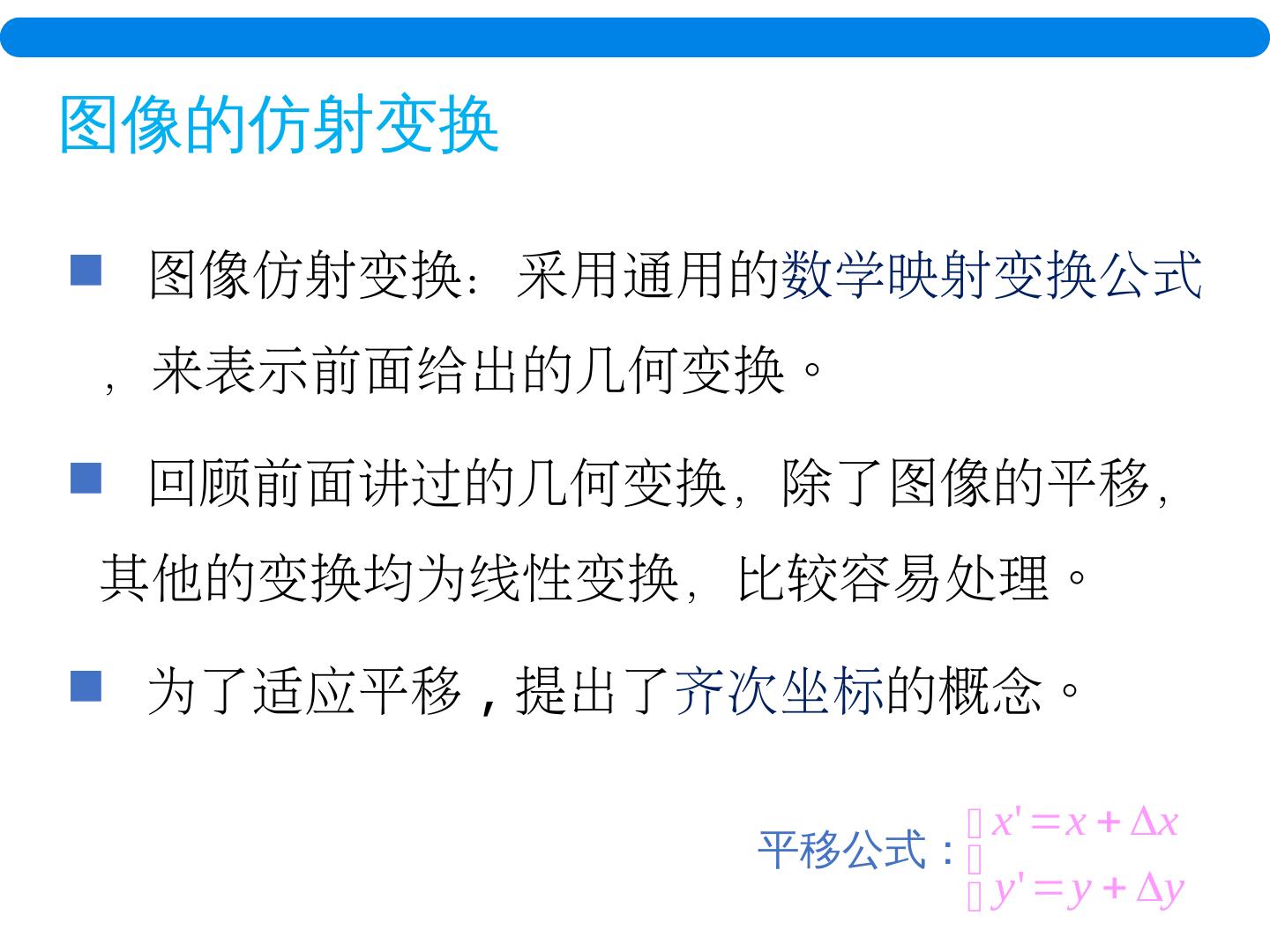 11 .图像的仿射变换 图像仿射变换:采用通用的 数学映射变换公式 ,来表示前面给出的几何变换。 回顾前面讲过的几何变换,除了图像的平移,其他的变换均为线性变换,比较容易处理。 为了适应平移 , 提出了 齐次坐标 的概念。 平移公式: