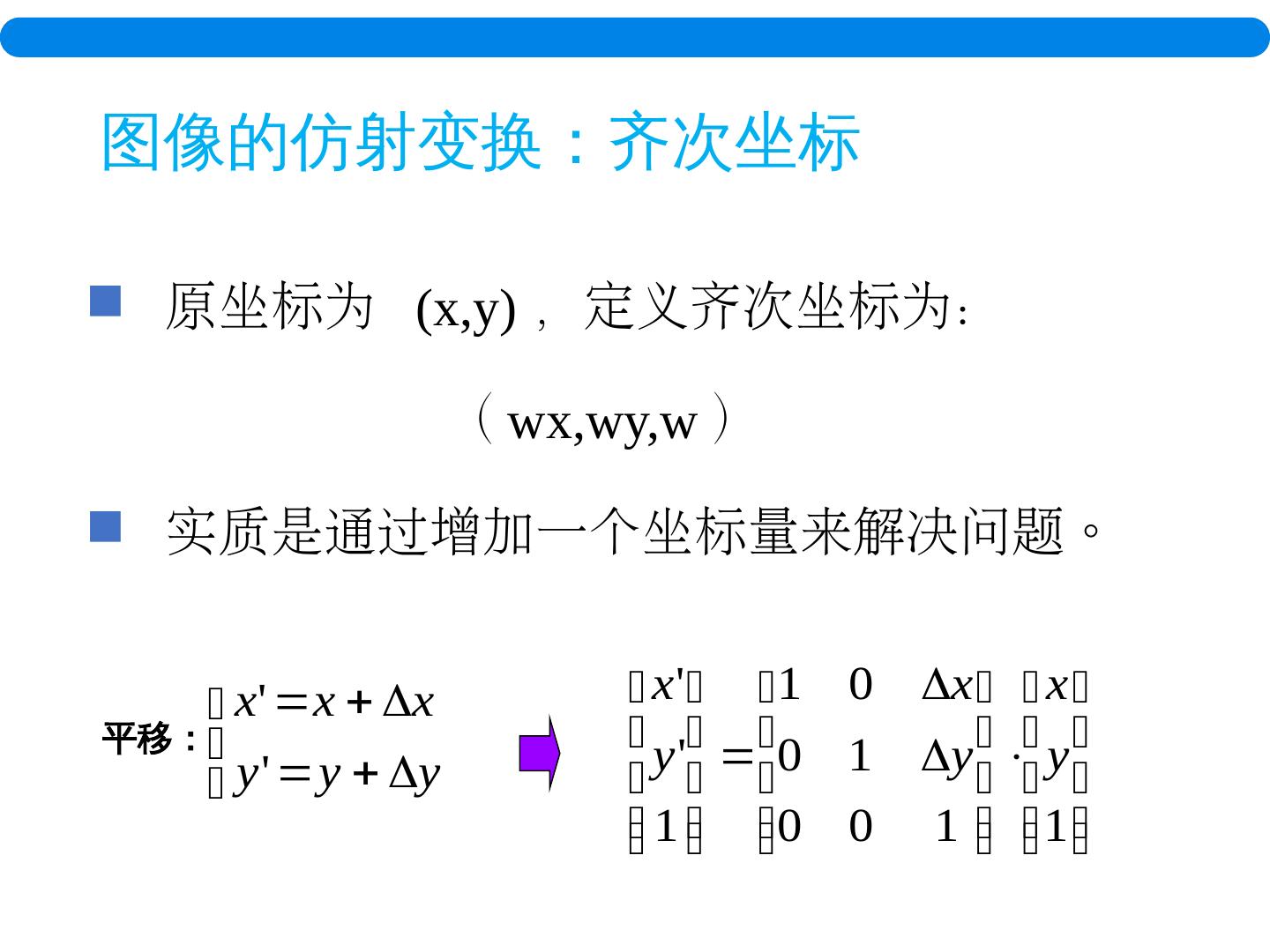 12 .图像的仿射变换:齐次坐标 原坐标为 ( x,y ) ,定义齐次坐标为: ( wx,wy,w ) 实质是通过增加一个坐标量来解决问题。 平移: