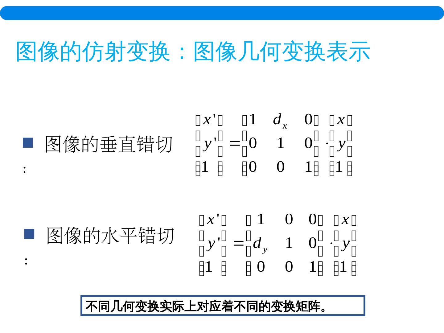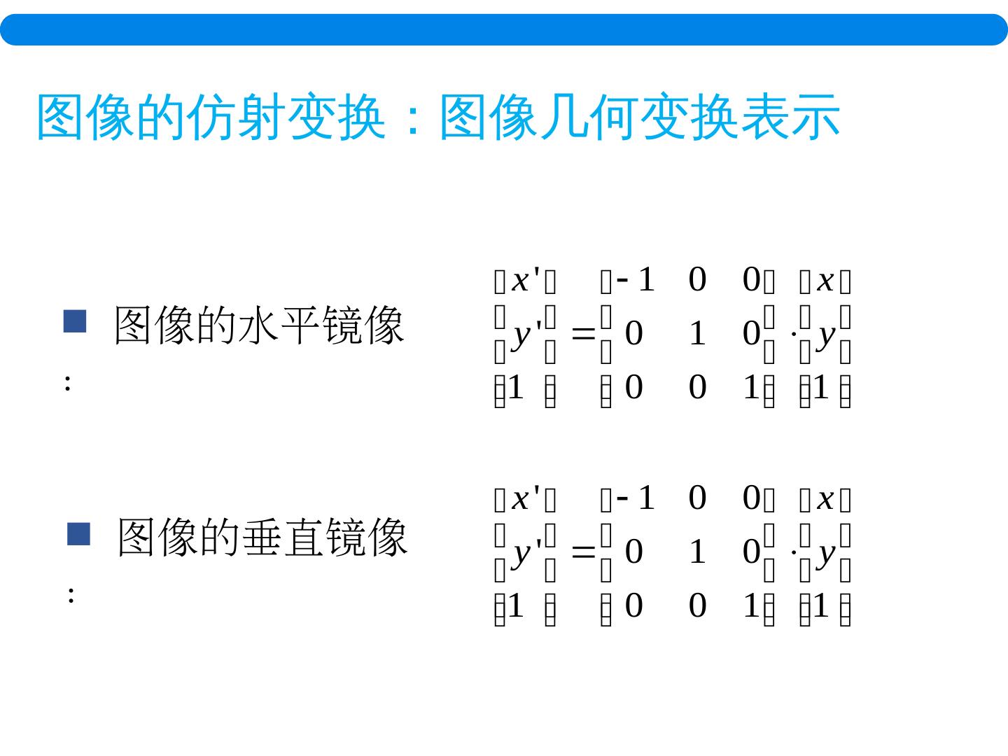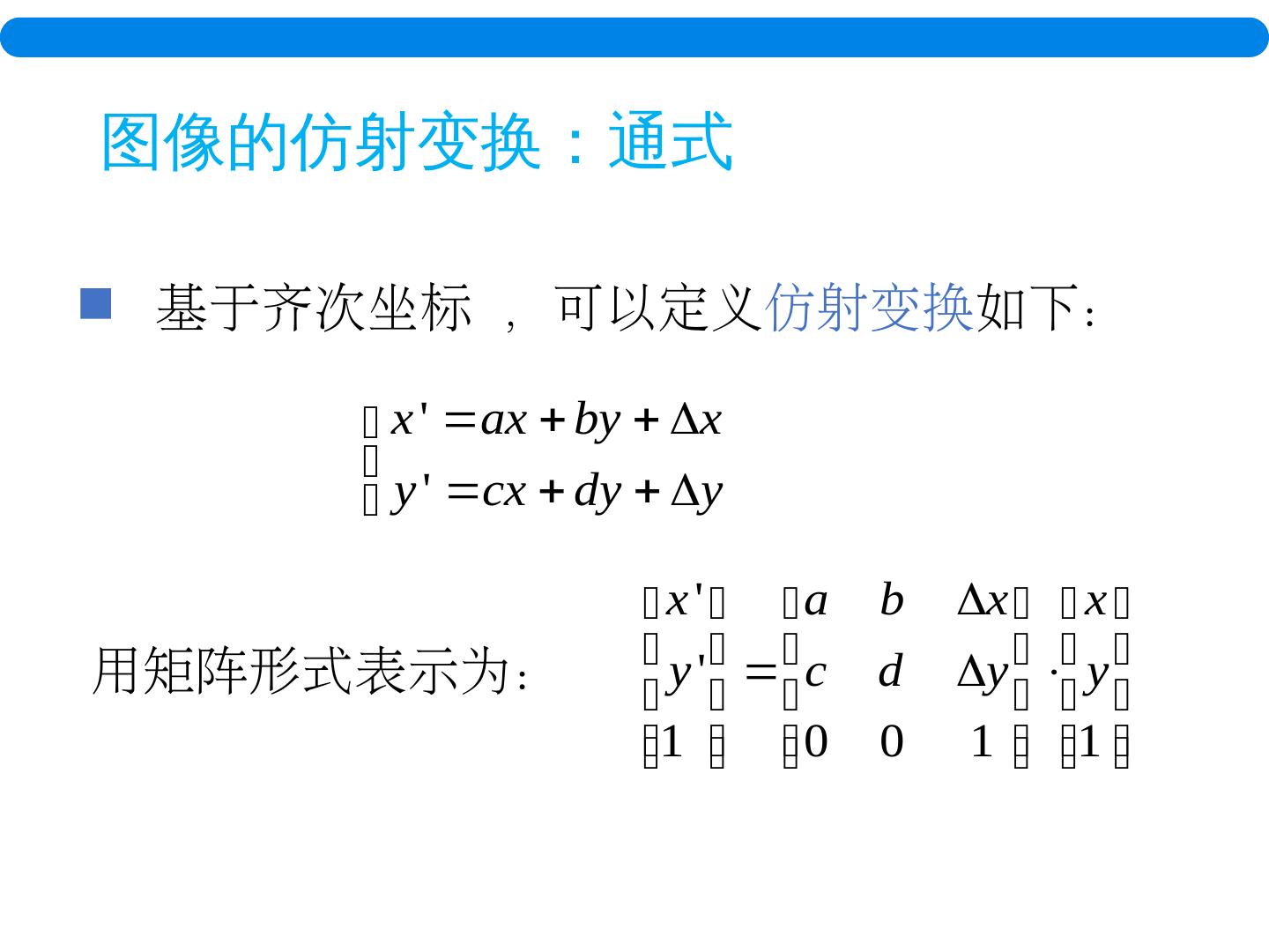 13 .图像的仿射变换:通式 基于齐次坐标 ,可以定义 仿射变换 如下: 用矩阵形式表示为: