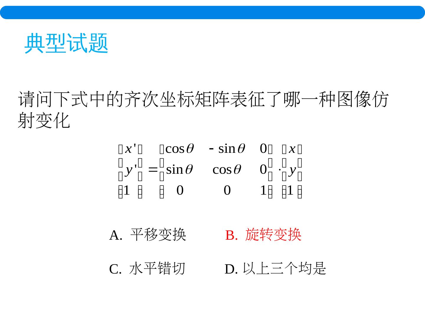 3 . 典型试题 请问下式中的齐次坐标矩阵表征了哪一种图像仿射变化 A. 平移变换 B. 旋转变换 C. 水平错切 D. 以上三个均是