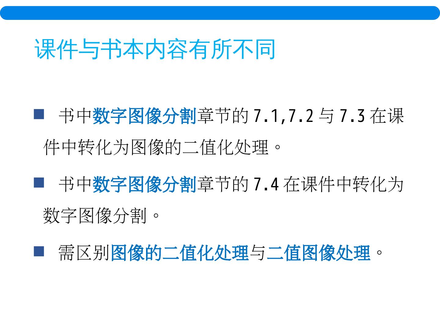 4 .课件与书本内容有所不同 书中 数字图像分割 章节的 7.1,7.2 与 7.3 在课件中转化为图像的二值化处理。 书中 数字图像分割 章节的 7.4 在课件中转化为数字图像分割。 需区别 图像的二值化处理 与 二值图像处理 。