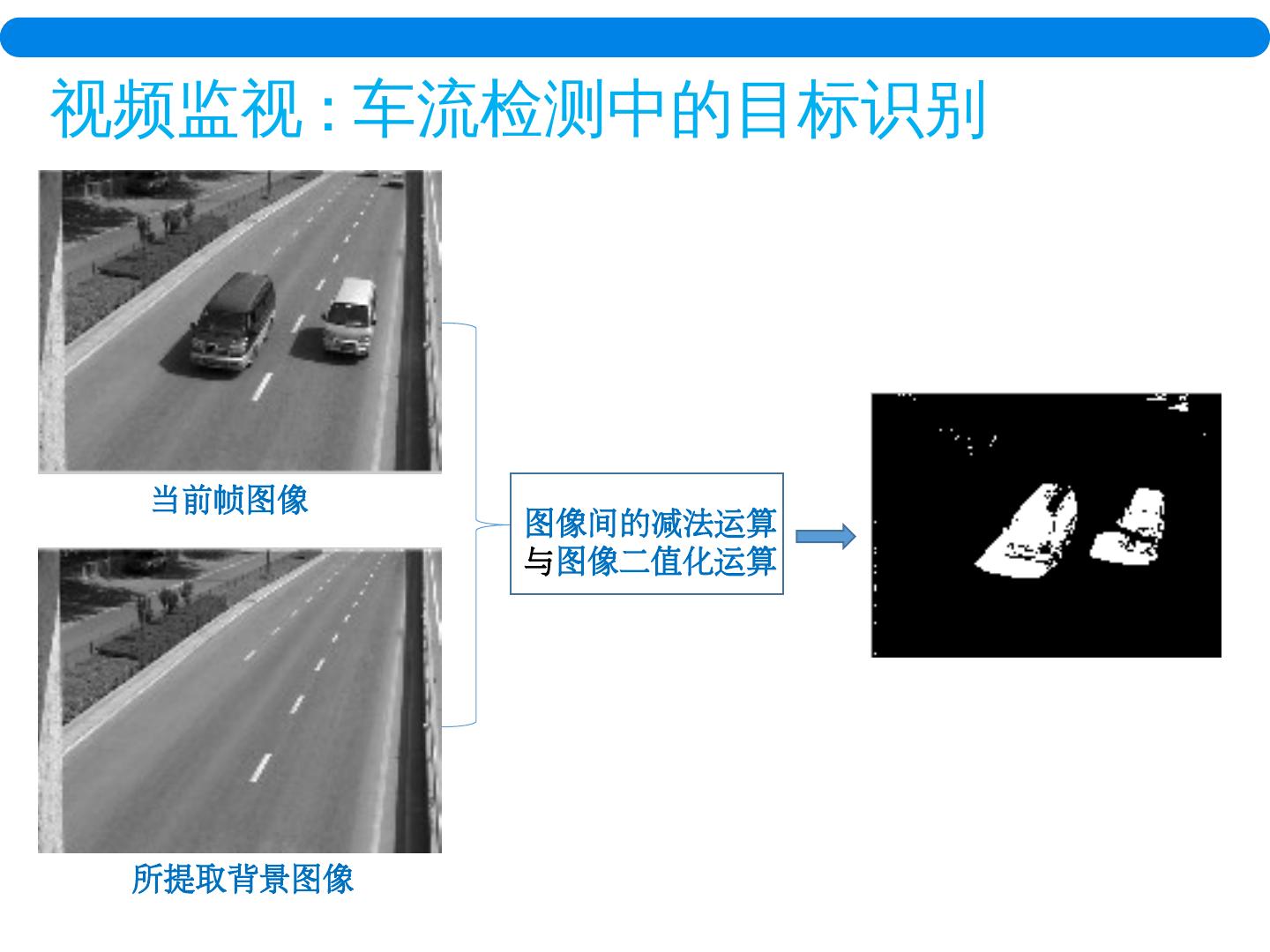 6 .视频 监视 : 车流 检测中 的目标识别 当前帧图像 所提取背景图像 图像间的减法运算 与 图像二值化运算