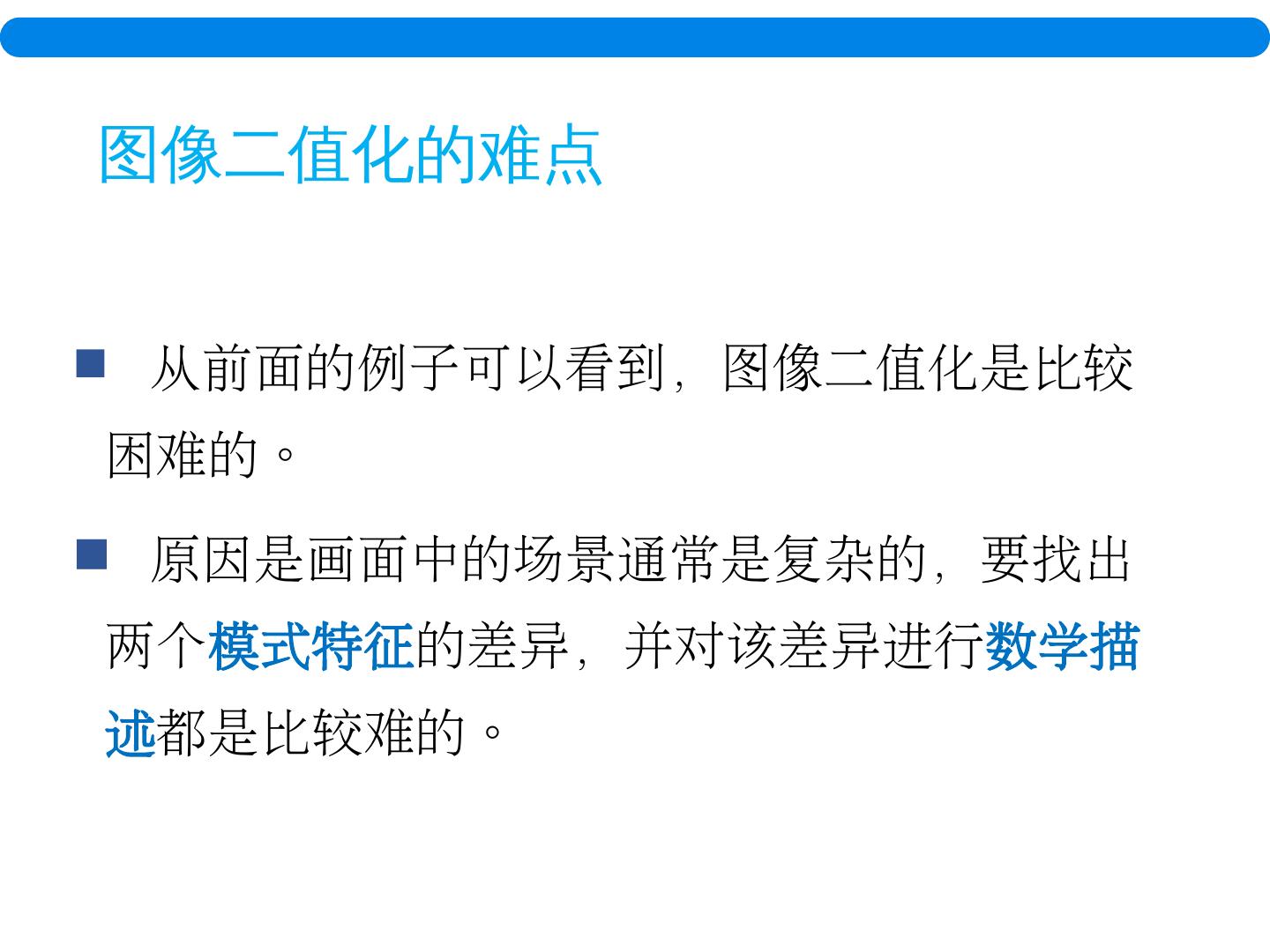 16 .图像二值化的难点 从前面的例子可以看到,图像二值化是比较困难的。 原因是画面中的场景通常是复杂的,要找出两个 模式特征 的差异,并对该差异进行 数学描述 都是比较难的。