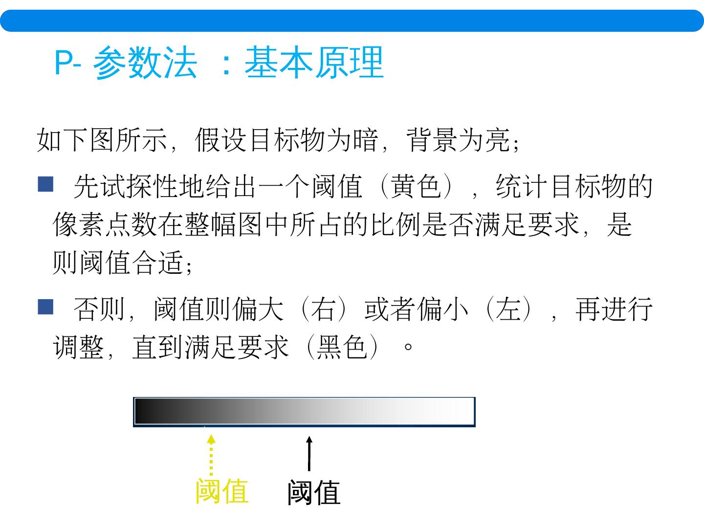 20 .P- 参数法 :基本原理 如下图所示,假设目标物为暗,背景为亮; 先试探性地给出一个阈值(黄色),统计目标物的像素点数在整幅图中所占的比例是否满足要求,是则阈值合适; 否则,阈值则偏大(右)或者偏小(左),再进行调整,直到满足要求(黑色)。 阈值 阈值