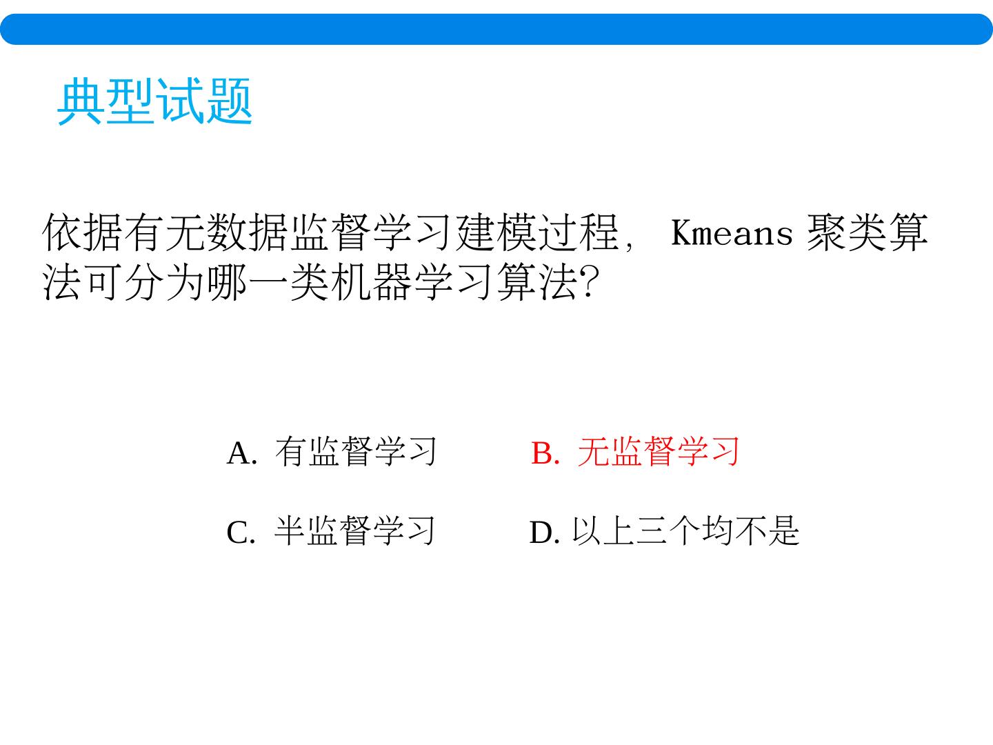 3 . 典型试题 依据有无数据监督学习建模过程, Kmeans 聚类算法可分为哪一类机器学习算法? A. 有监督学习 B. 无监督学习 C. 半监督学习 D. 以上三个均不是