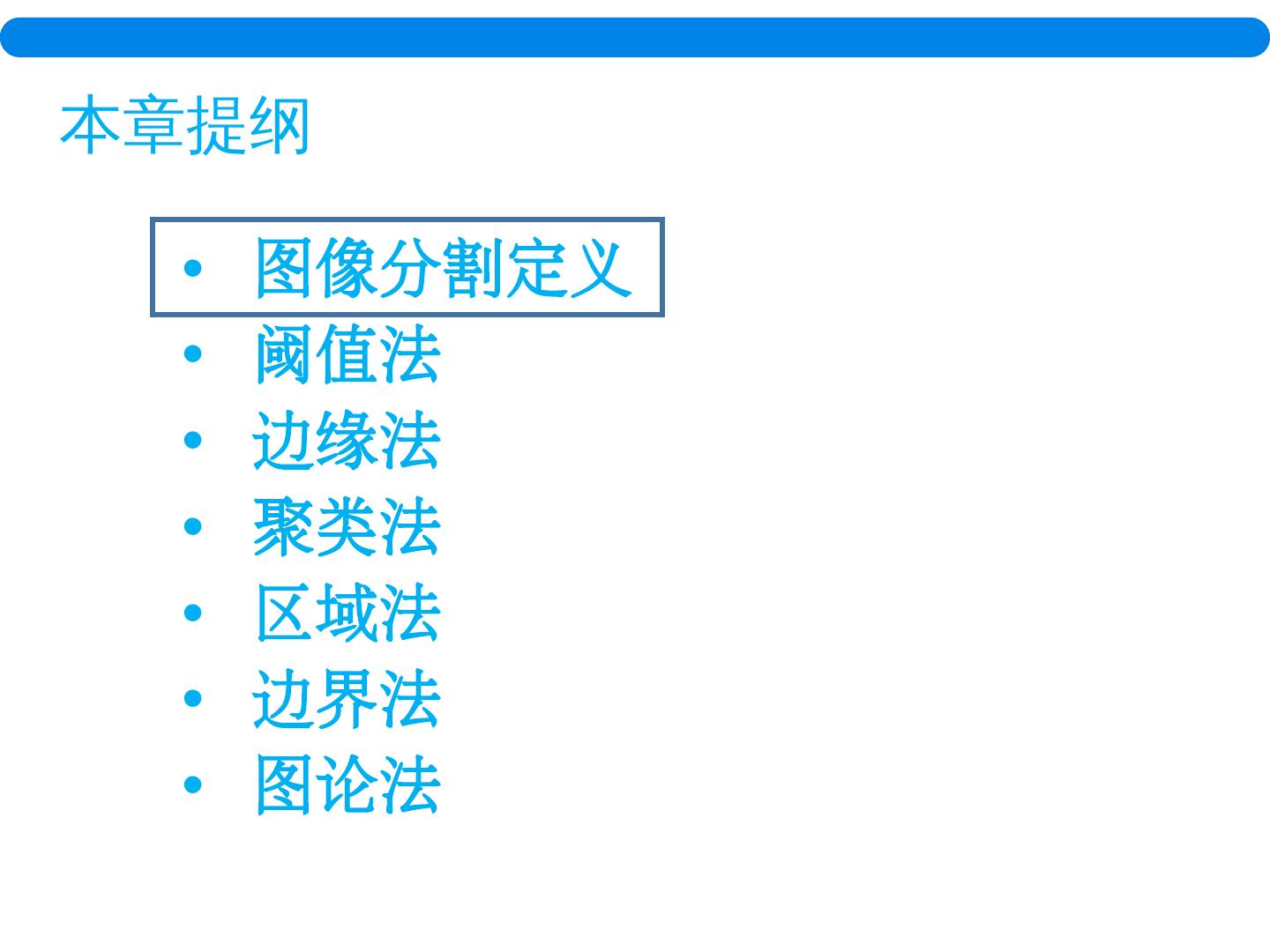 4 . 本章提纲 图像分割定义 阈值法 边缘法 聚类法 区域法 边界法 图论法