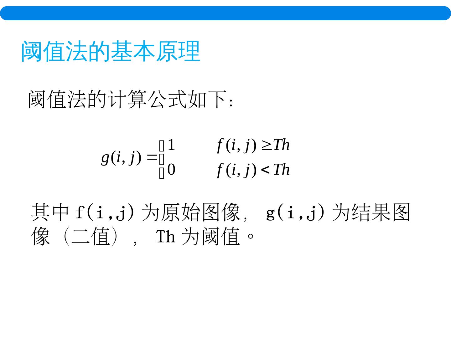 10 .阈值法的基本原理 阈值法的计算公式如下: 其中 f( i,j ) 为原始图像, g( i,j ) 为结果图像(二值), Th 为阈值。