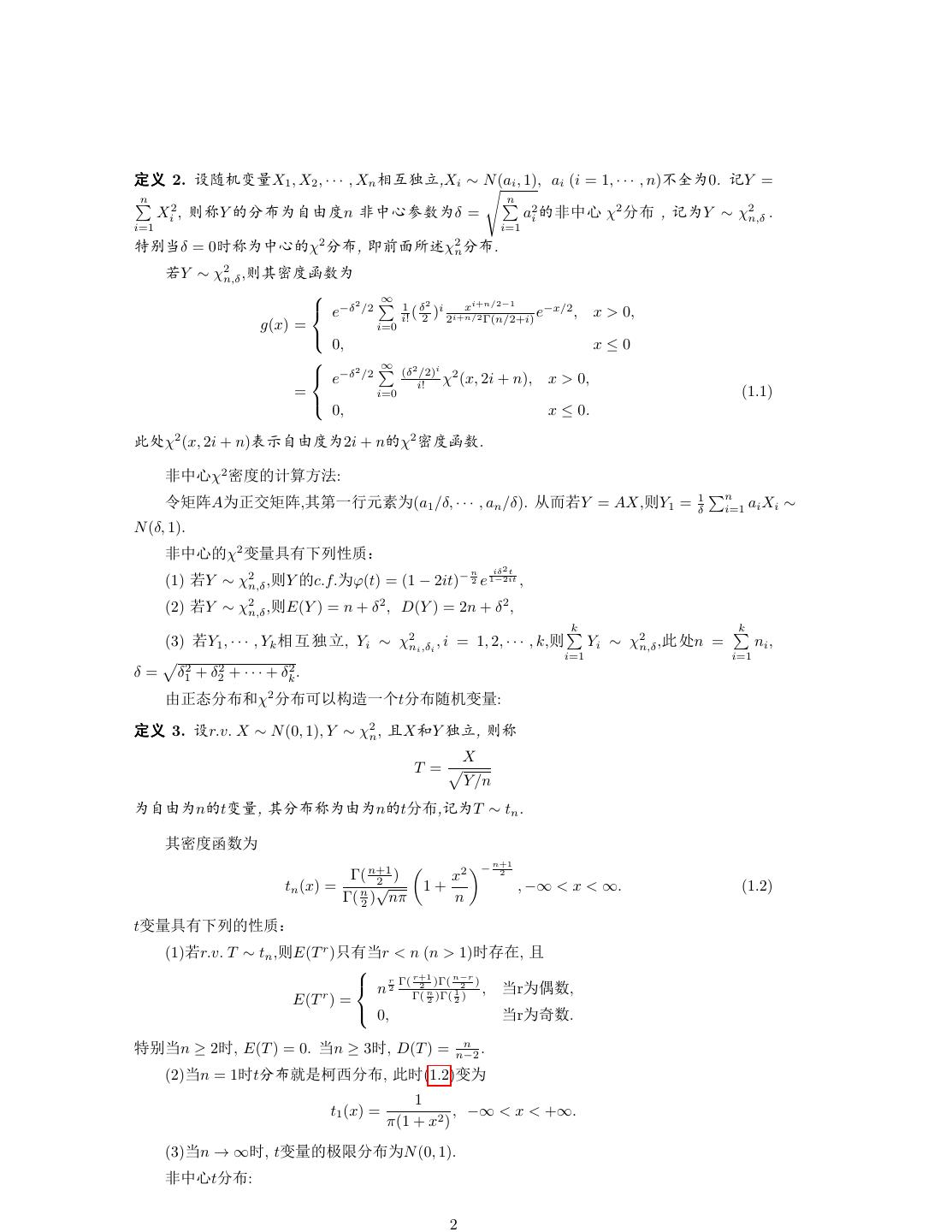2 .½  2. ‘ÅCþX1 , X2 , · · · , Xn ƒpÕá,Xi ∼ N (ai , 1), ai (i = 1, · · · , n)Ø •0. PY = n n Xi2 , K¡Y ©Ù•gdÝn š¥%ëê•δ = a2i š¥% χ2 ©Ù , P•Y ∼ χ2n,δ . i=1 i=1 AO δ = 0ž¡•¥% χ2 ©Ù, =c¡¤ãχ2n ©Ù. eY ∼ χ2n,δ ,KÙ—Ý¼ê• ∞ e−δ2 /2 1 δ2 i xi+n/2−1 −x/2 i! ( 2 ) 2i+n/2 Γ(n/2+i) e , x > 0, g(x) = i=0 0, x≤0 2 ∞ 2 i e−δ /2 (δ /2) i! χ2 (x, 2i + n), x > 0, = i=0 (1.1) 0, x ≤ 0. d?χ2 (x, 2i + n)L«gdÝ•2i + n χ2 —ݼê. š¥%χ2 —Ý OŽ•{: 1 n -Ý A• Ý ,Ù1˜1 ƒ•(a1 /δ, · · · , an /δ). l eY = AX,KY1 = δ i=1 ai Xi ∼ N (δ, 1). š¥% χ2 Cþäke 5Ÿµ n iδ 2 t (1) eY ∼ χ2n,δ ,KY c.f.•ϕ(t) = (1 − 2it)− 2 e 1−2it , (2) eY ∼ χ2n,δ ,KE(Y ) = n + δ 2 , D(Y ) = 2n + δ 2 , k k (3) eY1 , · · · , Yk ƒ p Õ á, Yi ∼ χ2ni ,δi , i = 1, 2, · · · , k,K Yi ∼ χ2n,δ ,d ?n = ni , i=1 i=1 δ= δ12 + δ22 + · · · + δk2 . d ©ÙÚχ2 ©ÙŒ± E˜‡t©Ù‘ÅCþ: ½  3. r.v. X ∼ N (0, 1), Y ∼ χ2n , …XÚY Õá, K¡ X T = Y /n •gd•n tCþ, ٩١•d•n t©Ù,P•T ∼ tn . Ù—Ý¼ê• − n+1 Γ( n+12 ) x2 2 tn (x) = √ 1+ , −∞ < x < ∞. (1.2) Γ( n2 ) nπ n tCþäke 5Ÿµ (1)er.v. T ∼ tn ,KE(T r )•k r < n (n > 1)ž•3, … n r2 Γ( r+1 n−r 2 )Γ( 2 ) , r•óê, r Γ( n )Γ( 1 2) E(T ) = 2 0, r•Ûê. n AO n ≥ 2ž, E(T ) = 0. n ≥ 3ž, D(T ) = n−2 . (2) n = 1žt©ÙÒ´…Ü©Ù, dž(1.2)C• 1 t1 (x) = , −∞ < x < +∞. π(1 + x2 ) (3) n → ∞ž, tCþ 4•©Ù•N (0, 1). š¥%t©Ù: 2