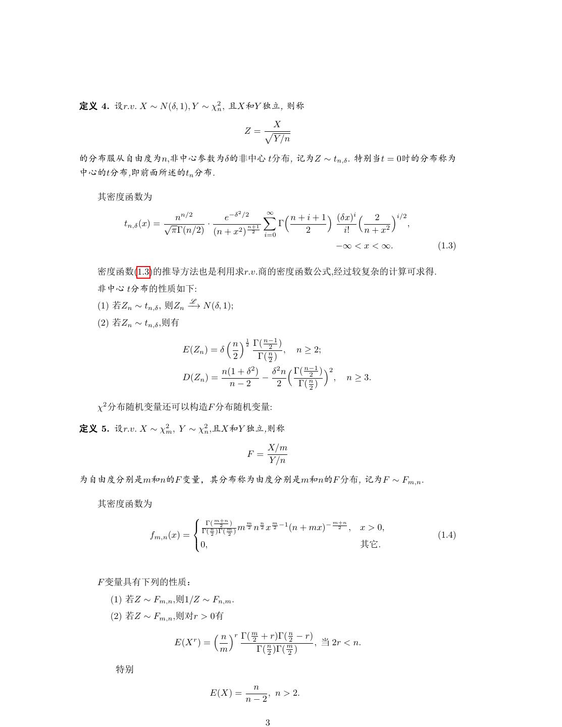 3 .½  4. r.v. X ∼ N (δ, 1), Y ∼ χ2n , …XÚY Õá, K¡ X Z= Y /n ©ÙÑlgdÝ•n,š¥%ëê•δ š¥% t©Ù, P•Z ∼ tn,δ . AO t = 0ž ©Ù¡• ¥% t©Ù,=c¡¤ã tn ©Ù. Ù—Ý¼ê• 2 ∞ nn/2 e−δ /2 n+i+1 (δx)i 2 i/2 tn,δ (x) = √ · Γ , πΓ(n/2) (n + x2 ) n+1 2 i=0 2 i! n + x2 −∞ < x < ∞. (1.3) —ݼê(1.3) í •{•´|^¦r.v.û —ݼêúª,²L E, OŽŒ¦ . š¥% t©Ù 5ŸXe: L (1) eZn ∼ tn,δ , KZn −→ N (δ, 1); (2) eZn ∼ tn,δ ,Kk n 1 2 Γ( n−1 2 ) E(Zn ) = δ , n ≥ 2; 2 Γ( n2 ) n(1 + δ 2 ) δ 2 n Γ( n−1 2 ) 2 D(Zn ) = − n , n ≥ 3. n−2 2 Γ( 2 ) χ2 ©Ù‘ÅCþ„Œ± EF ©Ù‘ÅCþ: ½  5. r.v. X ∼ χ2m , Y ∼ χ2n ,…XÚY Õá,K¡ X/m F = Y /n •gdÝ©O´mÚn F Cþ§Ù©Ù¡•dÝ©O´mÚn F ©Ù, P•F ∼ Fm,n . Ù—Ý¼ê• Γ( m+n 2 ) m n m −1 m+n Γ( n m m 2 n2 x 2 (n + mx)− 2 , x > 0, fm,n (x) = 2 )Γ( 2 ) (1.4) 0, Ù§. F Cþäke 5Ÿµ (1) eZ ∼ Fm,n ,K1/Z ∼ Fn,m . (2) eZ ∼ Fm,n ,Kér > 0k n r Γ( m n 2 + r)Γ( 2 − r) E(X r ) = n m , 2r < n. m Γ( 2 )Γ( 2 ) AO n E(X) = , n > 2. n−2 3