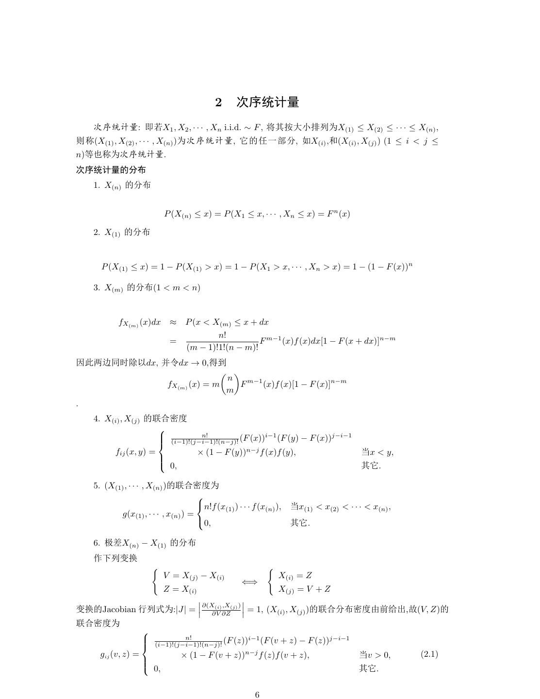 6 . 2 gSÚOþ gSÚOþ: =eX1 , X2 , · · · , Xn i.i.d. ∼ F , òÙUŒ ü •X(1) ≤ X(2) ≤ · · · ≤ X(n) , K¡(X(1) , X(2) , · · · , X(n) )•gSÚOþ, § ?˜Ü©, XX(i) ,Ú(X(i) , X(j) ) (1 ≤ i < j ≤ n) •¡•gSÚOþ. gSÚOþ ©Ù 1. X(n) ©Ù P (X(n) ≤ x) = P (X1 ≤ x, · · · , Xn ≤ x) = F n (x) 2. X(1) ©Ù P (X(1) ≤ x) = 1 − P (X(1) > x) = 1 − P (X1 > x, · · · , Xn > x) = 1 − (1 − F (x))n 3. X(m) ©Ù(1 < m < n) fX(m) (x)dx ≈ P (x < X(m) ≤ x + dx n! = F m−1 (x)f (x)dx[1 − F (x + dx)]n−m (m − 1)!1!(n − m)! Ïdü>Ӟرdx, ¿-dx → 0, n fX(m) (x) = m F m−1 (x)f (x)[1 − F (x)]n−m m . 4. X(i) , X(j) éÜ—Ý n! i−1 j−i−1 (i−1)!(j−i−1)!(n−j)! (F (x)) (F (y) − F (x)) fij (x, y) = × (1 − F (y))n−j f (x)f (y), x < y, Ù§. 0, 5. (X(1) , · · · , X(n) ) éÜ—Ý• n!f (x ) · · · f (x ), x(1) < x(2) < · · · < x(n) , (1) (n) g(x(1) , · · · , x(n) ) = 0, Ù§. 6. 4 X(n) − X(1) ©Ù Še C† V = X(j) − X(i) X(i) = Z ⇐⇒ Z = X(i) X(j) = V + Z ∂(X(i) ,X(j) ) C† Jacobian 1 ª•:|J| = ∂V ∂Z = 1, (X(i) , X(j) ) éܩٗÝdc‰Ñ, (V, Z) éÜ—Ý• n! i−1 (i−1)!(j−i−1)!(n−j)! (F (z)) (F (v + z) − F (z))j−i−1 gij (v, z) = n−j (2.1) × (1 − F (v + z)) f (z)f (v + z), v > 0, Ù§. 0, 6