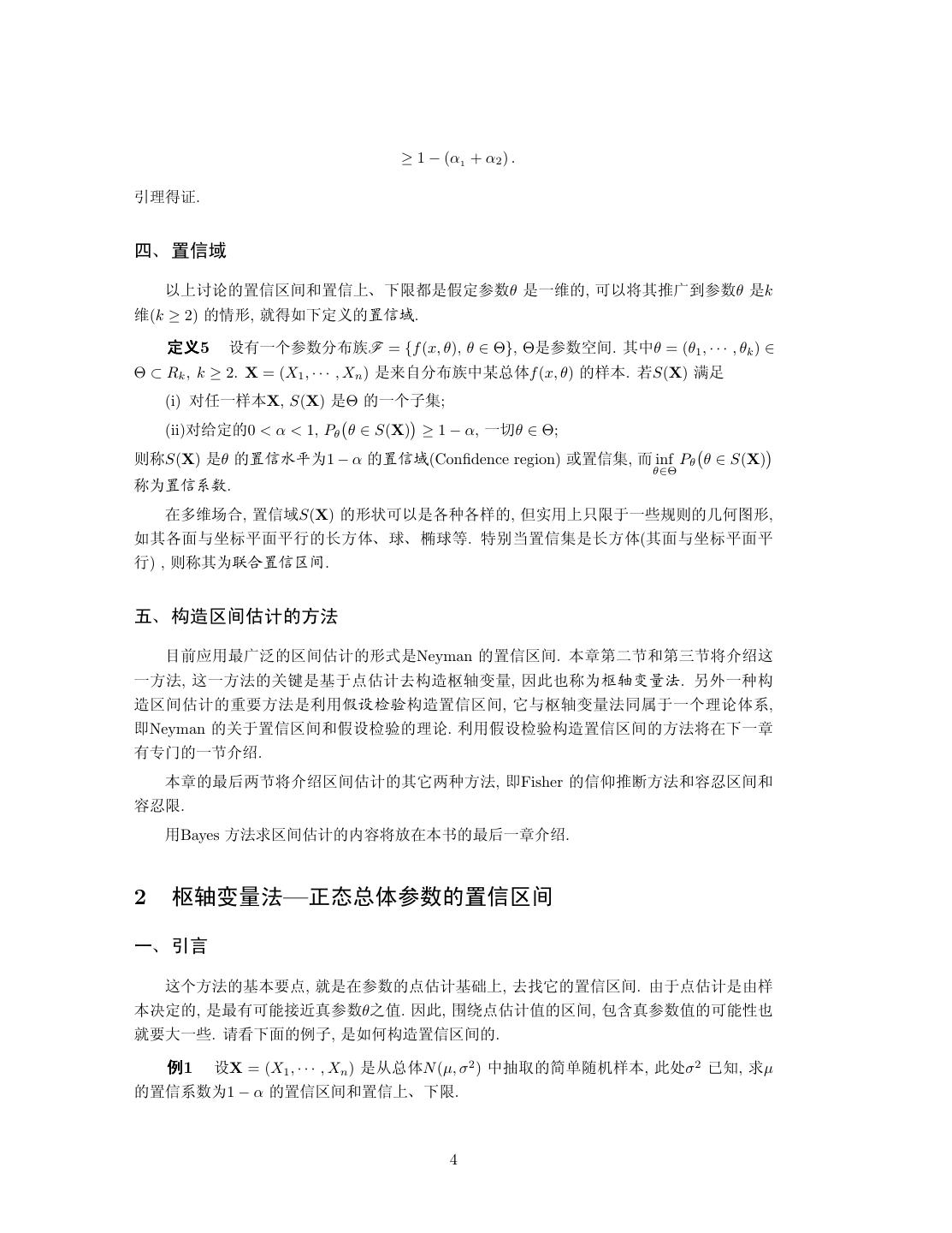 4 . ≥ 1 − (α1 + α2 ) . Ún y. o!˜&• ±þ?Ø ˜&«mÚ˜&þ!e•Ñ´b½ëêθ ´˜‘ , Œ±òÙí2 ëêθ ´k ‘(k ≥ 2) œ/, Ò Xe½Â ˜&•. ½Â5 k˜‡ëê©ÙxF = {f (x, θ), θ ∈ Θ}, Θ´ëê˜m. Ù¥θ = (θ1 , · · · , θk ) ∈ Θ ⊂ Rk , k ≥ 2. X = (X1 , · · · , Xn ) ´5g©Ùx¥,oNf (x, θ) . eS(X) ÷v (i) é?˜ X, S(X) ´Θ ˜‡f8; (ii)鉽 0 < α < 1, Pθ θ ∈ S(X) ≥ 1 − α, ˜ƒθ ∈ Θ; K¡S(X) ´θ ˜&Y²•1 − α ˜&•(Confidence region) ½˜&8, inf Pθ θ ∈ S(X) θ∈Θ ¡•˜&Xê. 3õ‘|Ü, ˜&•S(X) /GŒ±´ˆ«ˆ , ¢^þ••u˜ 5K AÛã/, XÙˆ¡†‹I²¡²1 ••N! ¥! ý¥ . AO ˜&8´••N(Ù¡†‹I²¡² 1) , K¡Ù•éܘ&«m. Ê! E«m O •{ 8cA^•2• «m O /ª´Neyman ˜&«m. Ù1 !Ú1n!ò0 ù ˜•{, ù˜•{ '…´Äu: O EͶCþ, Ïd•¡•ͶCþ{. , ˜« E«m O -‡•{´|^b u E˜&«m, §†Í¶Cþ{Óáu˜‡nØNX, =Neyman 'u˜&«mÚb u nØ. |^b u E˜&«m •{ò3e˜Ù k;€ ˜!0 . Ù • ü!ò0 «m O Ù§ü«•{, =Fisher & íä•{ÚN=«mÚ N=•. ^Bayes •{¦«m O SNò˜3 Ö • ˜Ù0 . 2 ͶCþ{— oNëê ˜&«m ˜!Úó ù‡•{ Ä ‡:, Ò´3ëê : OÄ:þ, é§ ˜&«m. du: O´d û½ , ´•kŒU CýëêθƒŠ. Ïd, Œ7: OŠ «m, •¹ýëêŠ ŒU5• Ò‡Œ˜ . žwe¡ ~f, ´XÛ E˜&«m . ~1 X = (X1 , · · · , Xn ) ´loNN (µ, σ 2 ) ¥Ä {ü‘Å , d?σ 2 ®•, ¦µ ˜&Xê•1 − α ˜&«mÚ˜&þ!e•. 4