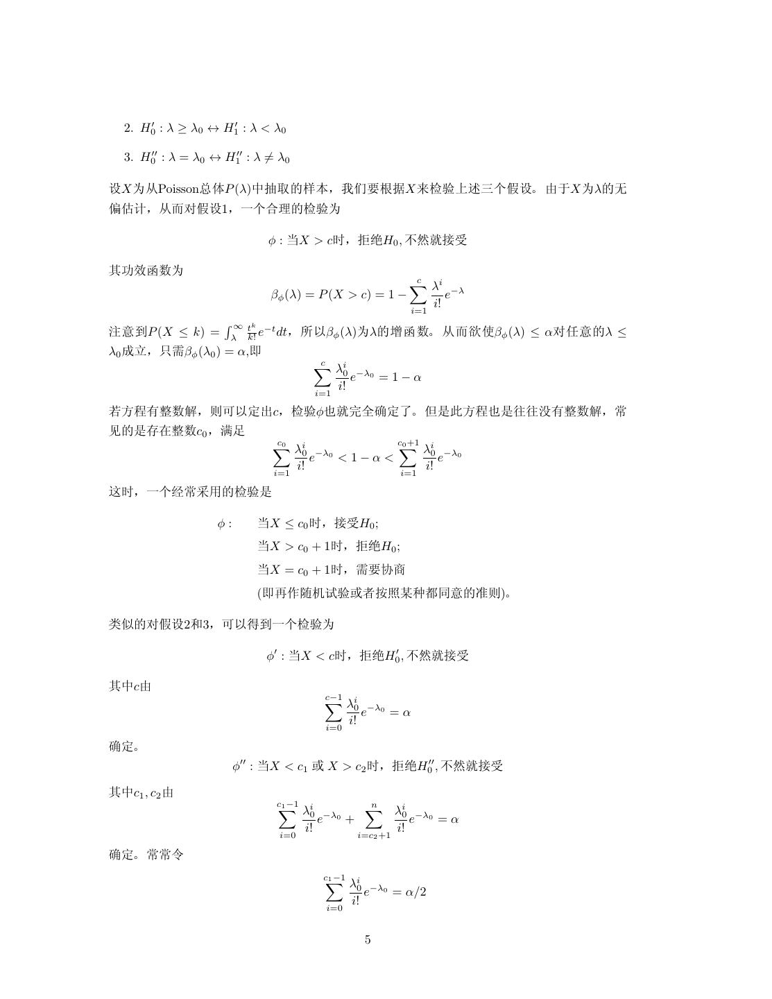 4 . n! 1−p k 5¿ P (X ≤ k) = k!(n−k−1)! 0 t (1 − t)n−k−1 dt§=βφ (p)•p O¼ê" Ïd–¦þª u uα§•Iβφ (p0 ) = α"= c n i n−i p q =1−α i=0 i 0 0 d•§ vk ê)§ ~„ ´•3c0 §¦ c0 c0 +1 n i n−i n i n−i p q <1−α< p q i=0 i 0 0 i=0 i 0 0 ùž§˜‡²~æ^ u ´ φ: X ≤ c0 ž§ ÉH0 ; X > c0 + 1ž§áýH0 ; X = c0 + 1ž§I‡ û (=2Š‘ÅÁ ½öUì,«ÑÓ¿ OK)" aq éb 2Ú3§Œ± ˜‡u • φ : X ≥ cž§ ÉH0 , Ø,Òáý Ù¥cd c−1 n i n−i p q =α i=0 i 0 0 (½" φ : c1 ≤ X ≤ c2 ž§ ÉH0 , Ø,Òáý Ù¥c1 , c2 d c1 −1 n n i n−i n i n−i p q + p q =α i=0 i 0 0 i=c i 0 0 2 +1 (½"~~- c1 −1 n i n−i p q = α/2 i=0 i 0 0 n n i n−i p q = α/2 i=c2 +1 i 0 0 ±½Ñc1 , c2" 1.3 PoissonoNëê u éPoissonoNëê u § aqu ‘©ÙoNëê u "•ÄXen«/ª b 1. H0 : λ ≤ λ0 ↔ H1 : λ > λ0 4