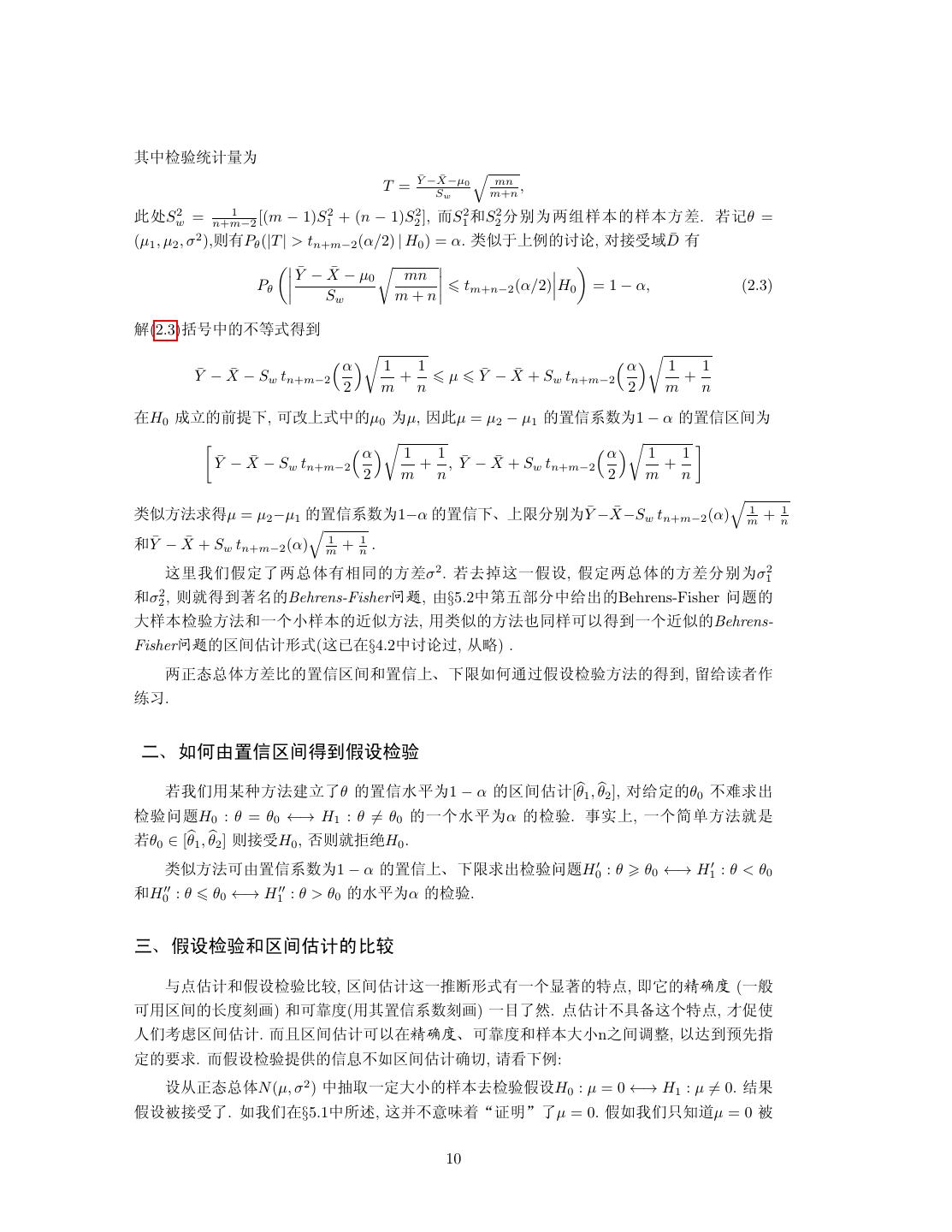 10 .Ù¥u ÚOþ• Y¯ −X−µ ¯ mn T = Sw 0 m+n , 1 d?Sw 2 = n+m−2 [(m − 1)S12 + (n − 1)S22 ], S12 ÚS22 ©O•ü| • . ePθ = (µ1 , µ2 , σ ),KkPθ (|T | > tn+m−2 (α/2) | H0 ) = α. aquþ~ 2 ?Ø, é ¯ k É•D Y¯ − X¯ − µ0 mn Pθ tm+n−2 (α/2) H0 = 1 − α, (2.3) Sw m+n )(2.3))Ò¥ Ø ª ¯ − Sw tn+m−2 α Y¯ − X 1 + 1 µ ¯ + Sw tn+m−2 α Y¯ − X 1 + 1 2 m n 2 m n 3H0 ¤á cJe, ŒUþª¥ µ0 •µ, Ïdµ = µ2 − µ1 ˜&Xê•1 − α ˜&«m• ¯ − Sw tn+m−2 α Y¯ − X 1 1 ¯ + Sw tn+m−2 α + , Y¯ − X 1 + 1 2 m n 2 m n aq•{¦ µ = µ2 −µ1 ˜&Xê•1−α ˜&e!þ•©O•Y¯ −X−S ¯ w tn+m−2 (α) 1 m + 1 n ÚY¯ − X ¯ + Sw tn+m−2 (α) 1 m + 1 n . ùp·‚b½ üoNkƒÓ • σ2 . e Kù˜b , b½üoN • ©O•σ12 Úσ22 , KÒ Í¶ Behrens-Fisher¯K, d§5.2¥1ÊÜ©¥‰Ñ Behrens-Fisher ¯K Œ u •{Ú˜‡ Cq•{, ^aq •{•Ó Œ± ˜‡Cq Behrens- Fisher¯K «m O/ª(ù®3§4.2¥?ØL, lÑ) . ü oN• ' ˜&«mÚ˜&þ!e•XÛÏLb u •{ , 3‰ÖöŠ öS. !XÛd˜&«m b u e·‚^,«•{ïá θ ˜&Y²•1 − α «m O[θ1 , θ2 ], 鉽 θ0 ØJ¦Ñ u ¯KH0 : θ = θ0 ←→ H1 : θ = θ0 ˜‡Y²•α u . ¯¢þ, ˜‡{ü•{Ò´ eθ0 ∈ [θ1 , θ2 ] K ÉH0 , ÄKÒáýH0 . aq•{Œd˜&Xê•1 − α ˜&þ!e•¦Ñu ¯KH0 : θ θ0 ←→ H1 : θ < θ0 ÚH0 : θ θ0 ←→ H1 : θ > θ0 Y²•α u . n!b u Ú«m O ' †: OÚb u ' , «m Où˜íä/ªk˜‡wÍ A:, =§ °(Ý (˜„ Œ^«m •Ý•x) ÚŒ‚Ý(^Ù˜&Xê•x) ˜8 ,. : OØä ù‡A:, âr¦ <‚•Ä«m O. …«m OŒ±3°(Ý!Œ‚ÝÚ Œ nƒmN , ±ˆ ýk• ½ ‡¦. b u Jø &EØX«m O(ƒ, žwe~: l oNN (µ, σ ) ¥Ä 2 ˜½Œ u b H0 : µ = 0 ←→ H1 : µ = 0. (J b É . X·‚3§5.1¥¤ã, ù¿Ø¿›X/y²0 µ = 0. bX·‚•• µ=0 10