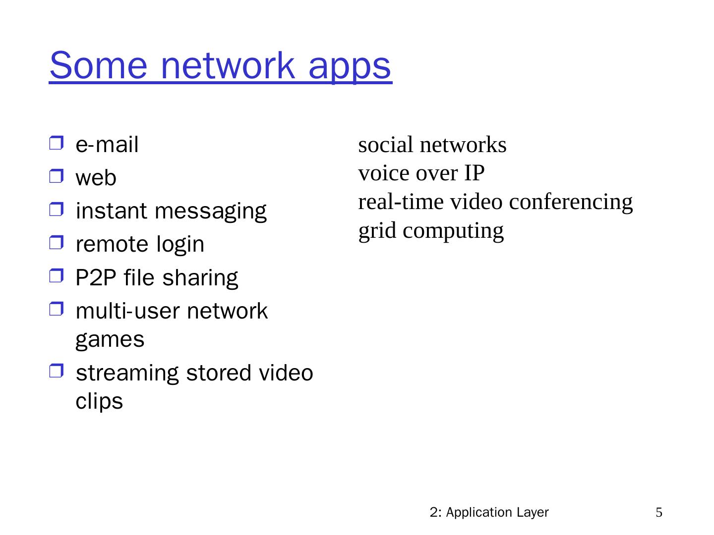 5 .2: Application Layer 5 Some network apps e-mail web instant messaging remote login P2P file sharing multi-user network games streaming stored video clips social networks voice over IP real-time video conferencing grid computing