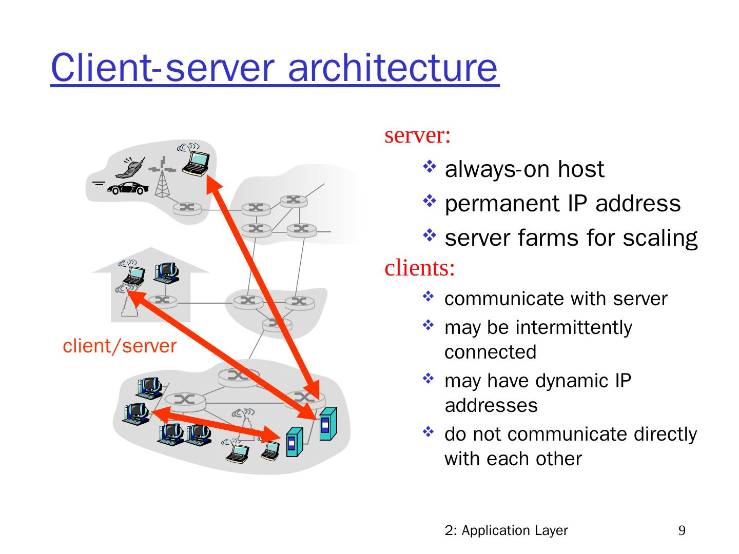 9 .2: Application Layer 9 Client-server architecture server: always-on host permanent IP address server farms for scaling clients: communicate with server may be intermittently connected may have dynamic IP addresses do not communicate directly with each other client/server
