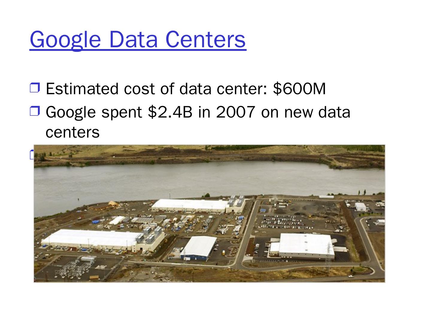 10 .Google Data Centers Estimated cost of data center: $600M Google spent $2.4B in 2007 on new data centers Each data center uses 50-100 megawatts of power
