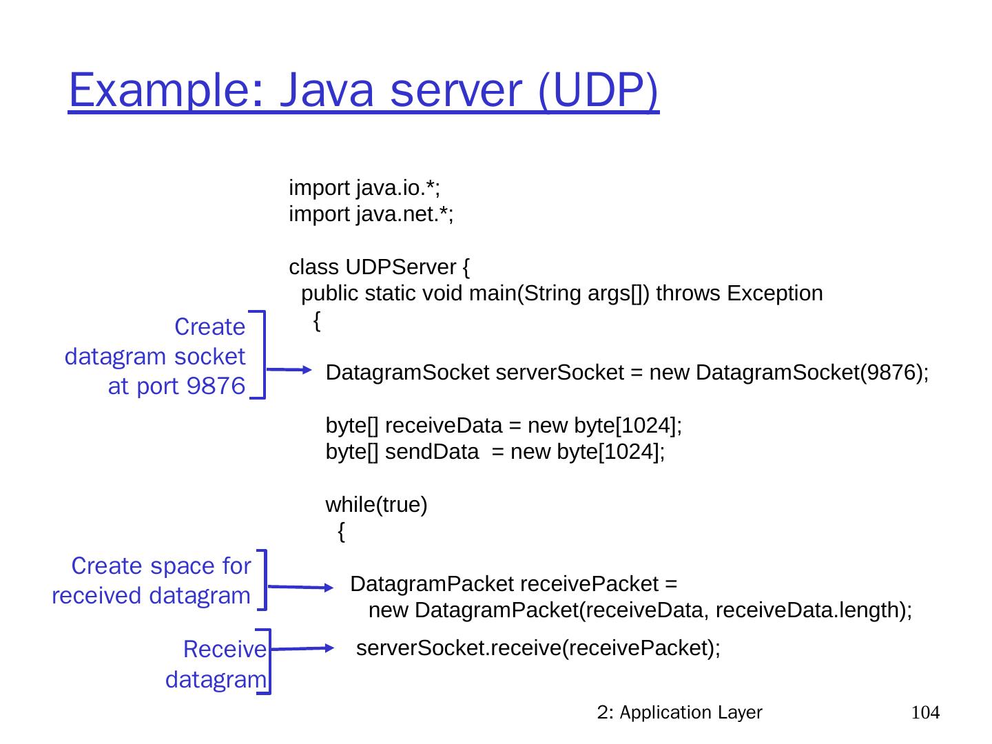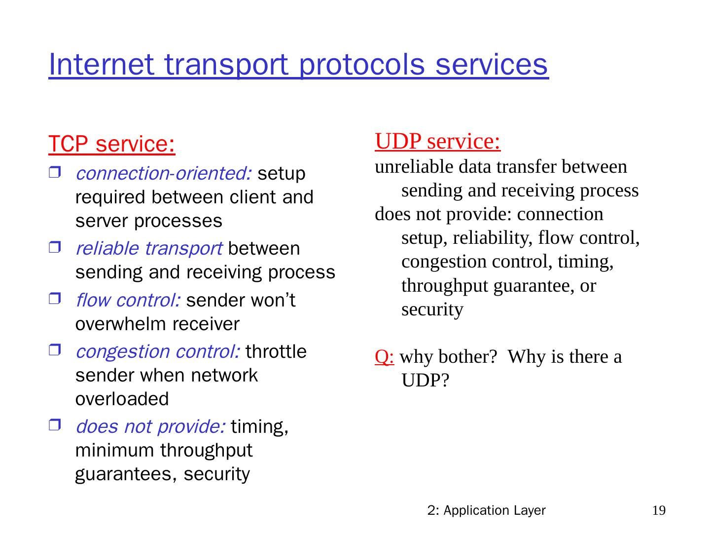19 .2: Application Layer 19 Internet transport protocols services TCP service: connection-oriented: setup required between client and server processes reliable transport between sending and receiving process flow control: sender won’t overwhelm receiver congestion control: throttle sender when network overloaded does not provide: timing, minimum throughput guarantees, security UDP service: unreliable data transfer between sending and receiving process does not provide: connection setup, reliability, flow control, congestion control, timing, throughput guarantee, or security Q: why bother? Why is there a UDP?