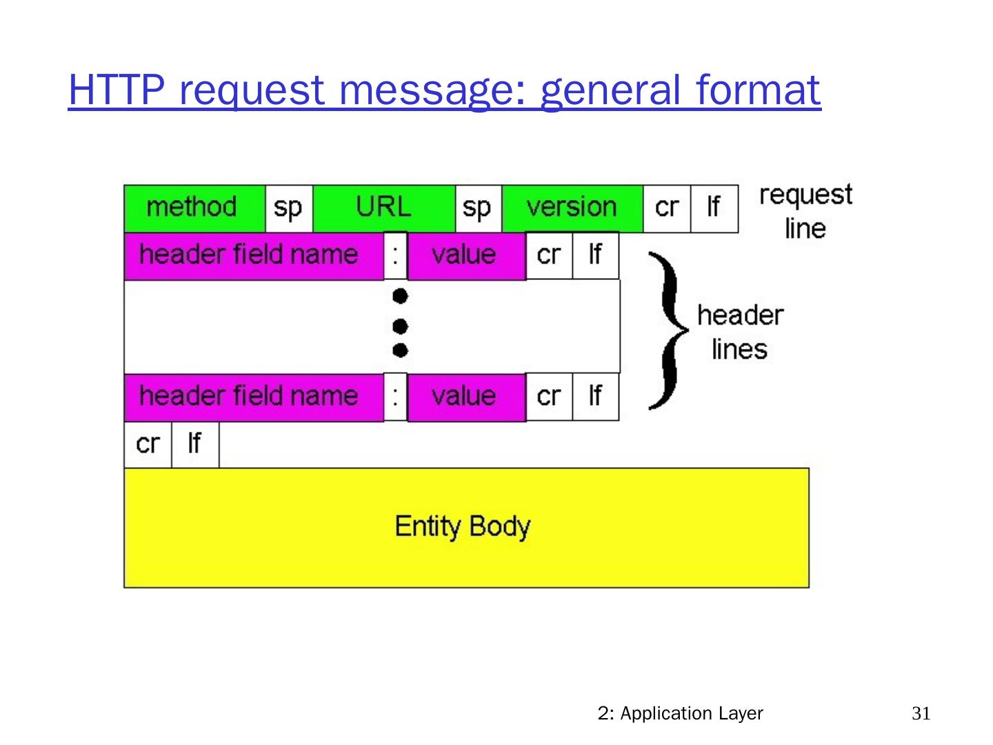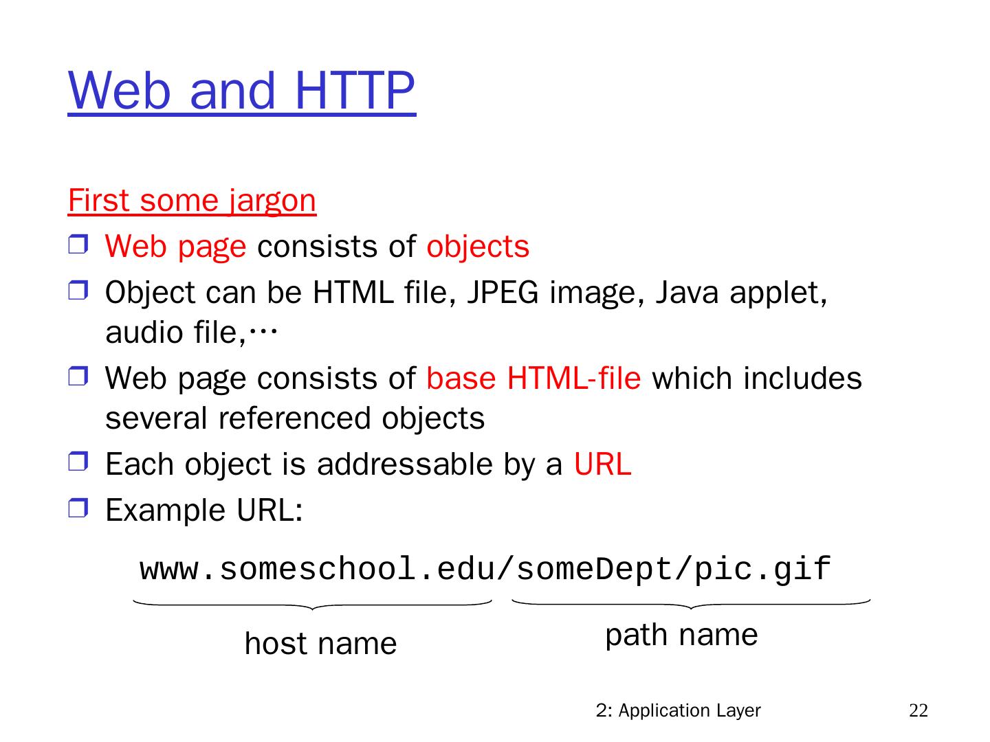22 .2: Application Layer 22 Web and HTTP First some jargon Web page consists of objects Object can be HTML file, JPEG image, Java applet, audio file,… Web page consists of base HTML-file which includes several referenced objects Each object is addressable by a URL Example URL: www.someschool.edu/someDept/pic.gif host name path name