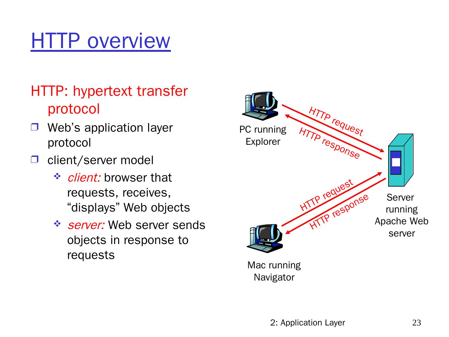 23 .2: Application Layer 23 HTTP overview HTTP: hypertext transfer protocol Web’s application layer protocol client/server model client: browser that requests, receives, “displays” Web objects server: Web server sends objects in response to requests PC running Explorer Server running Apache Web server Mac running Navigator HTTP request HTTP request HTTP response HTTP response