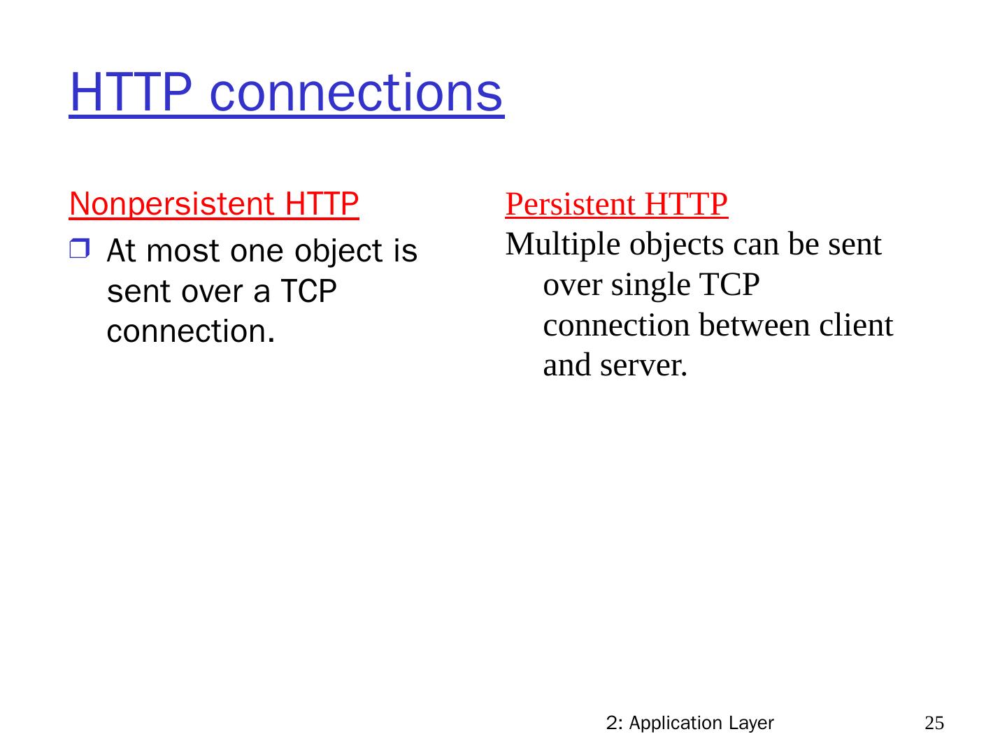 25 .2: Application Layer 25 HTTP connections Nonpersistent HTTP At most one object is sent over a TCP connection. Persistent HTTP Multiple objects can be sent over single TCP connection between client and server.