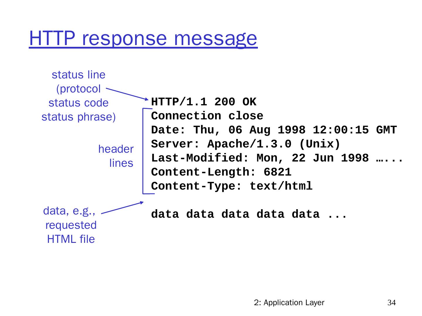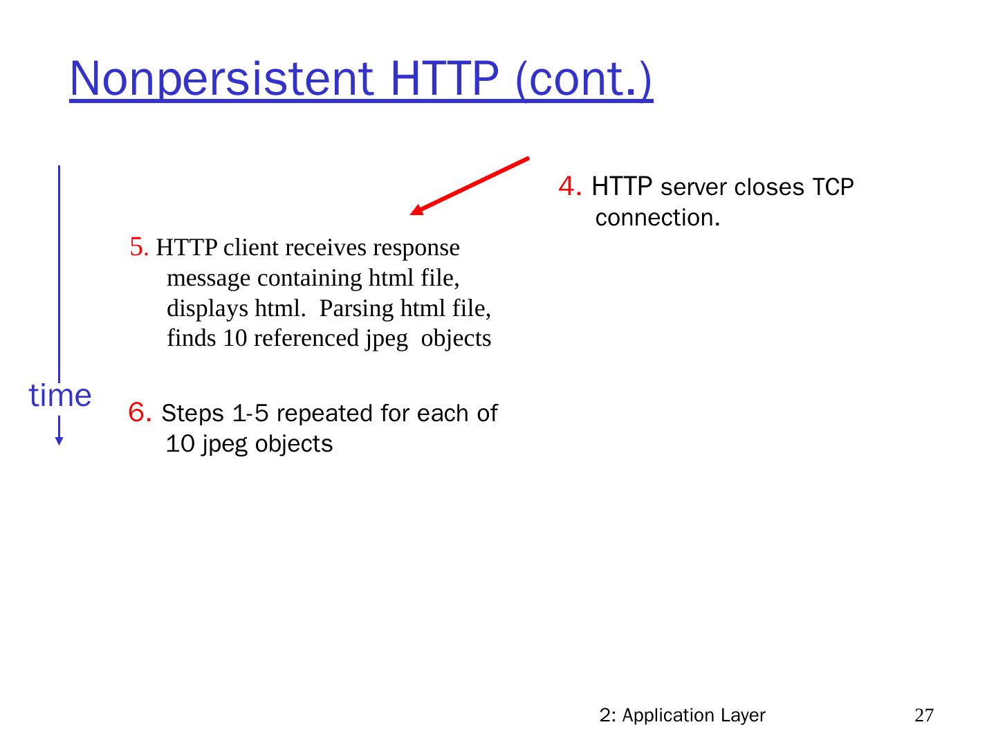 27 .2: Application Layer 27 Nonpersistent HTTP (cont.) 5 . HTTP client receives response message containing html file, displays html. Parsing html file, finds 10 referenced jpeg objects 6. Steps 1-5 repeated for each of 10 jpeg objects 4. HTTP server closes TCP connection. time
