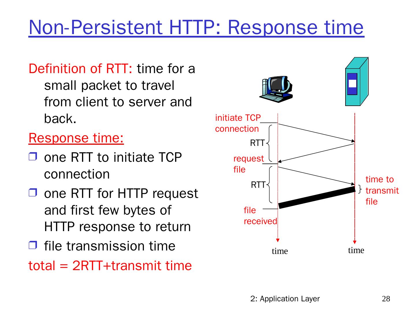 28 .2: Application Layer 28 Non-Persistent HTTP: Response time Definition of RTT: time for a small packet to travel from client to server and back. Response time: one RTT to initiate TCP connection one RTT for HTTP request and first few bytes of HTTP response to return file transmission time total = 2RTT+transmit time time to transmit file initiate TCP connection RTT request file RTT file received time time