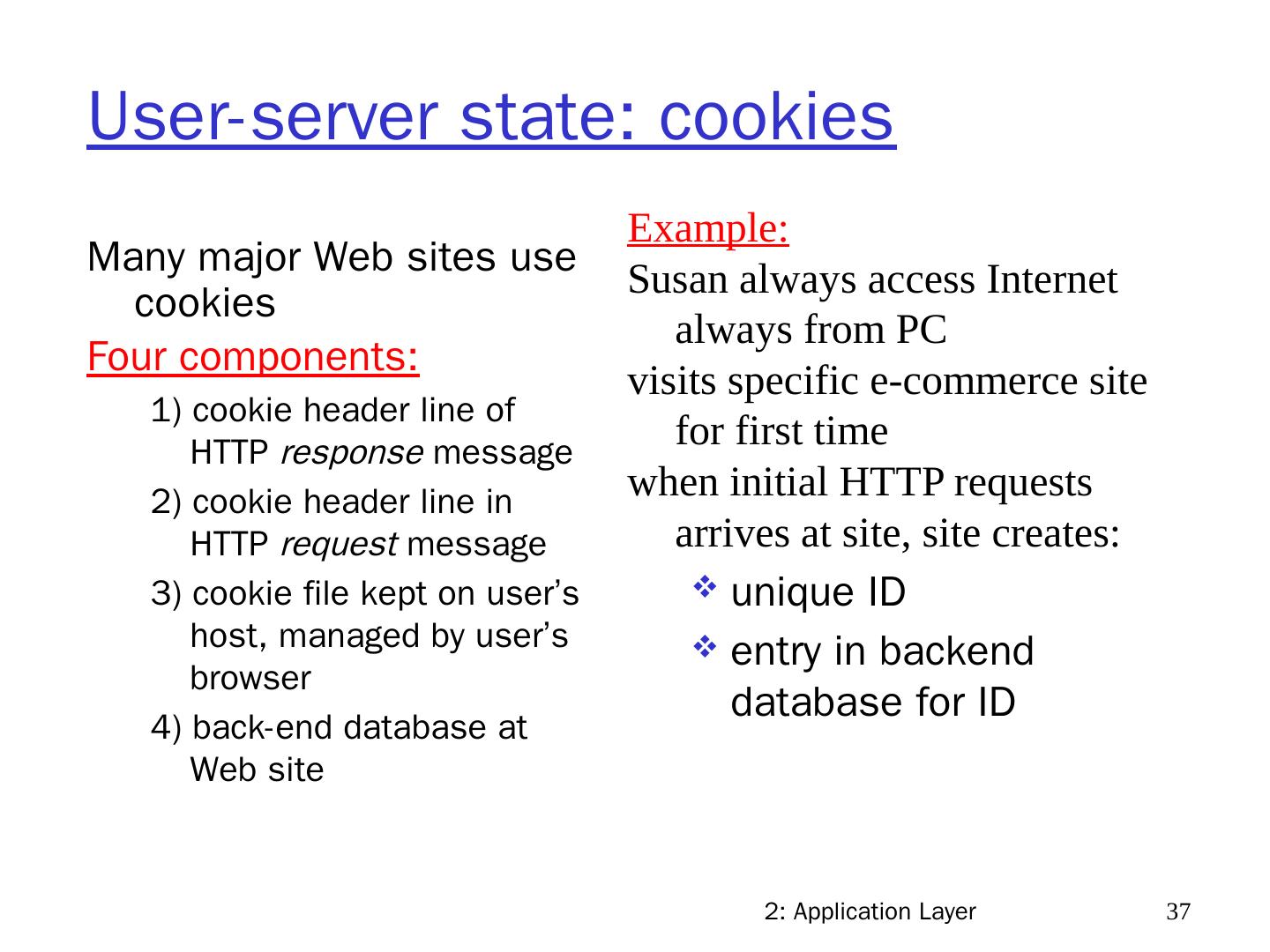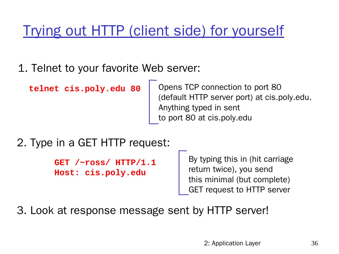 24 .2: Application Layer 24 HTTP overview (continued) Uses TCP: client initiates TCP connection (creates socket) to server, port 80 server accepts TCP connection from client HTTP messages (application-layer protocol messages) exchanged between browser (HTTP client) and Web server (HTTP server) TCP connection closed HTTP is “stateless” server maintains no information about past client requests Protocols that maintain “state” are complex! past history (state) must be maintained if server/client crashes, their views of “state” may be inconsistent, must be reconciled aside