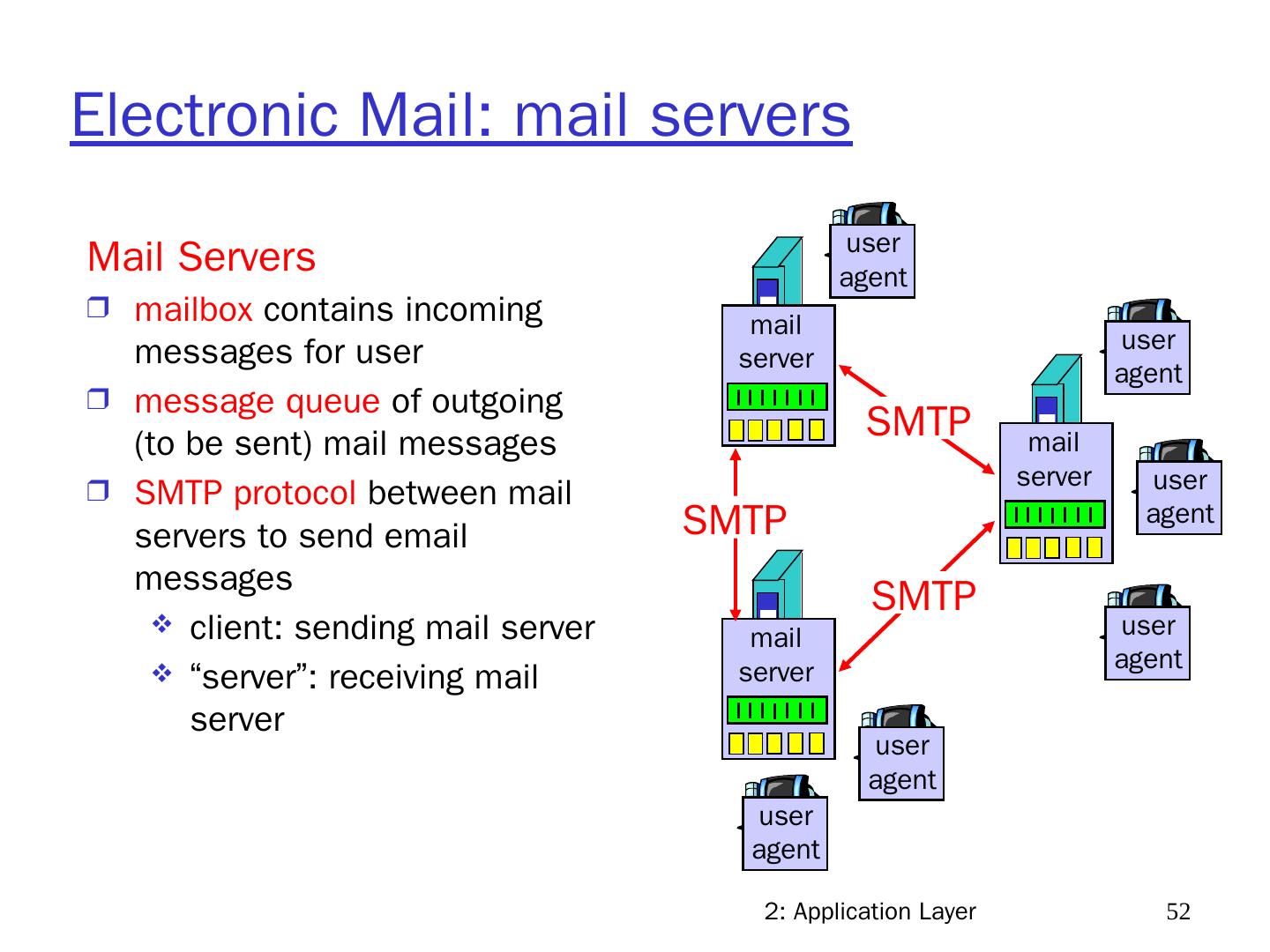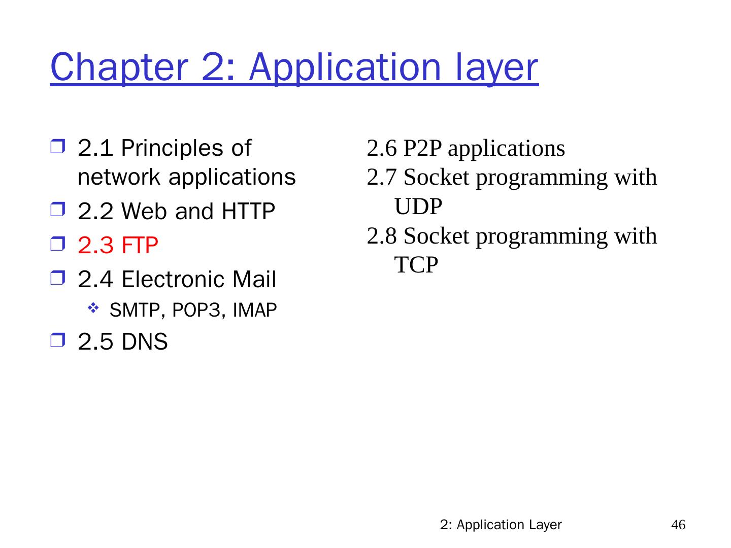21 .2: Application Layer 21 Chapter 2: Application layer 2.1 Principles of network applications 2.2 Web and HTTP 2.3 FTP 2.4 Electronic Mail SMTP, POP3, IMAP 2.5 DNS 2.6 P2P applications 2.7 Socket programming with UDP 2.8 Socket programming with TCP