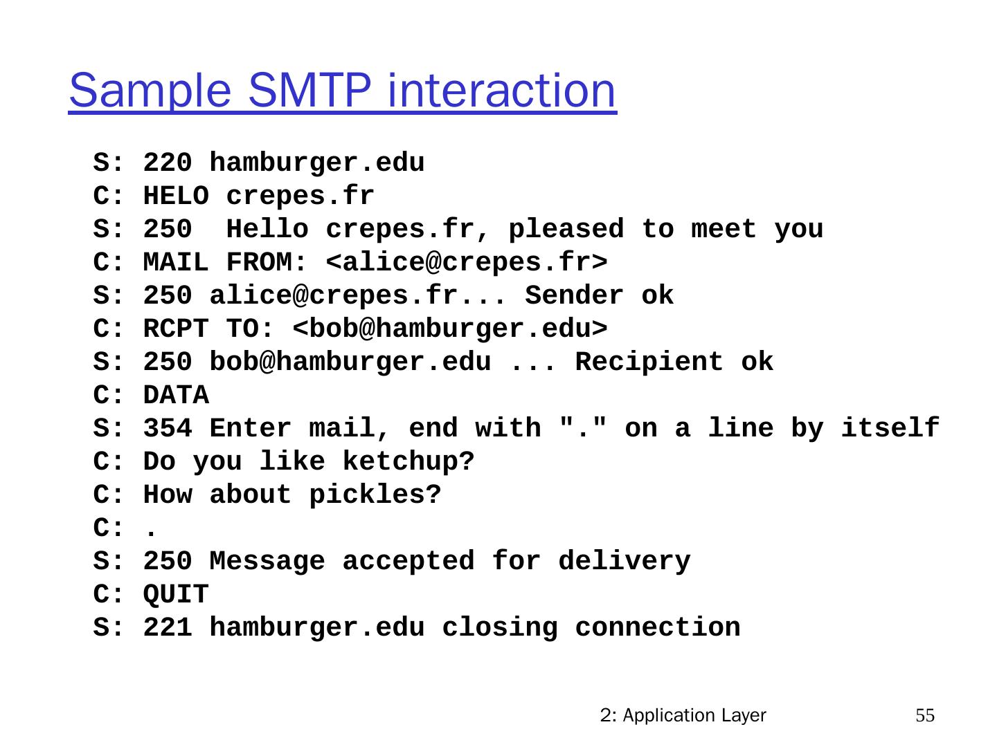 20 .2: Application Layer 20 Internet apps: application, transport protocols Application e-mail remote terminal access Web file transfer streaming multimedia Internet telephony Application layer protocol SMTP [RFC 2821] Telnet [RFC 854] HTTP [RFC 2616] FTP [RFC 959] HTTP (eg Youtube), RTP [RFC 1889] SIP, RTP, proprietary (e.g., Skype) Underlying transport protocol TCP TCP TCP TCP TCP or UDP typically UDP