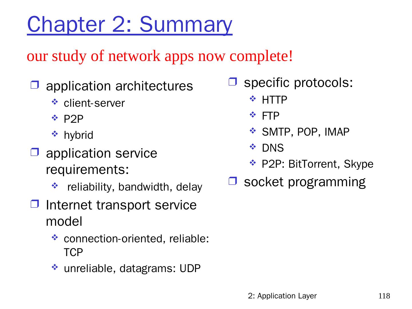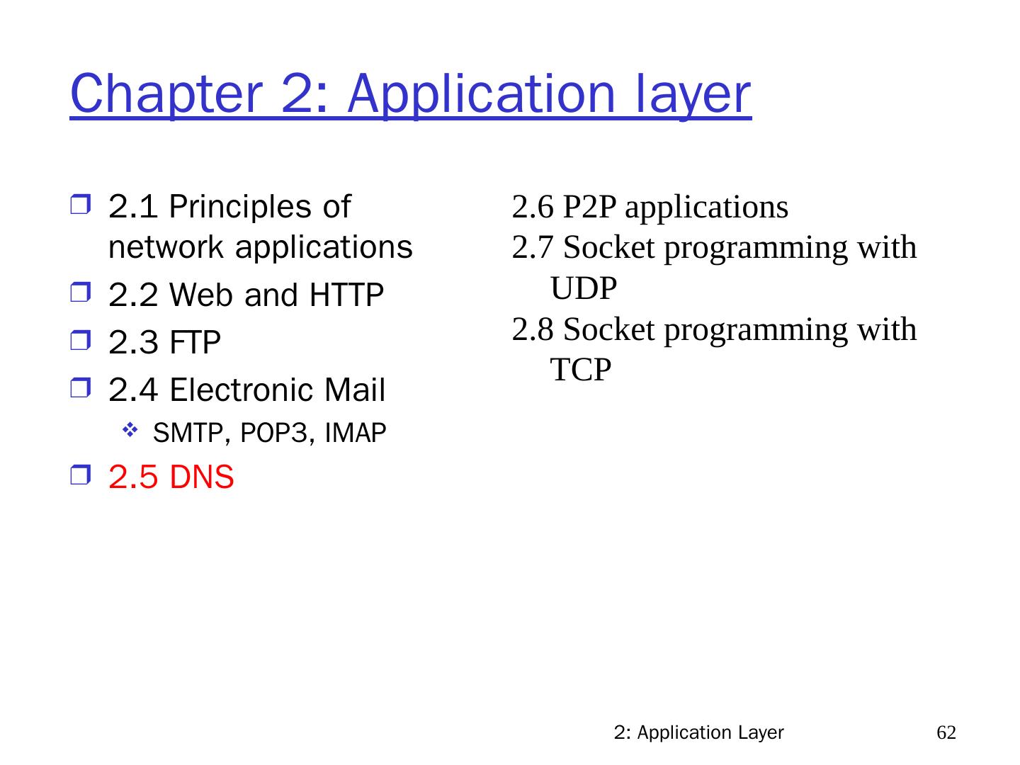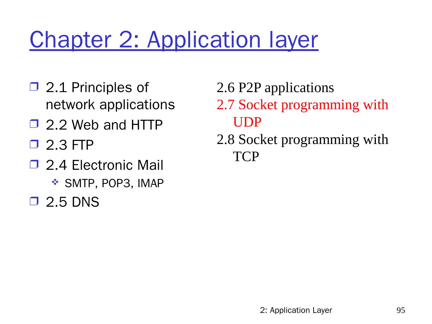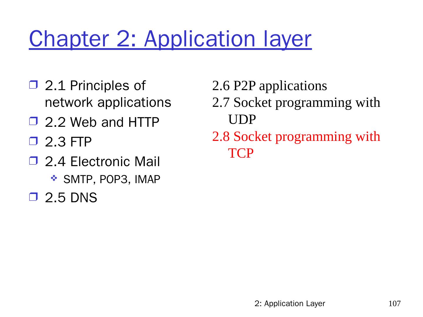 7 .2: Application Layer 7 Chapter 2: Application layer 2.1 Principles of network applications 2.2 Web and HTTP 2.3 FTP 2.4 Electronic Mail SMTP, POP3, IMAP 2.5 DNS 2.6 P2P applications 2.7 Socket programming with UDP 2.8 Socket programming with TCP
