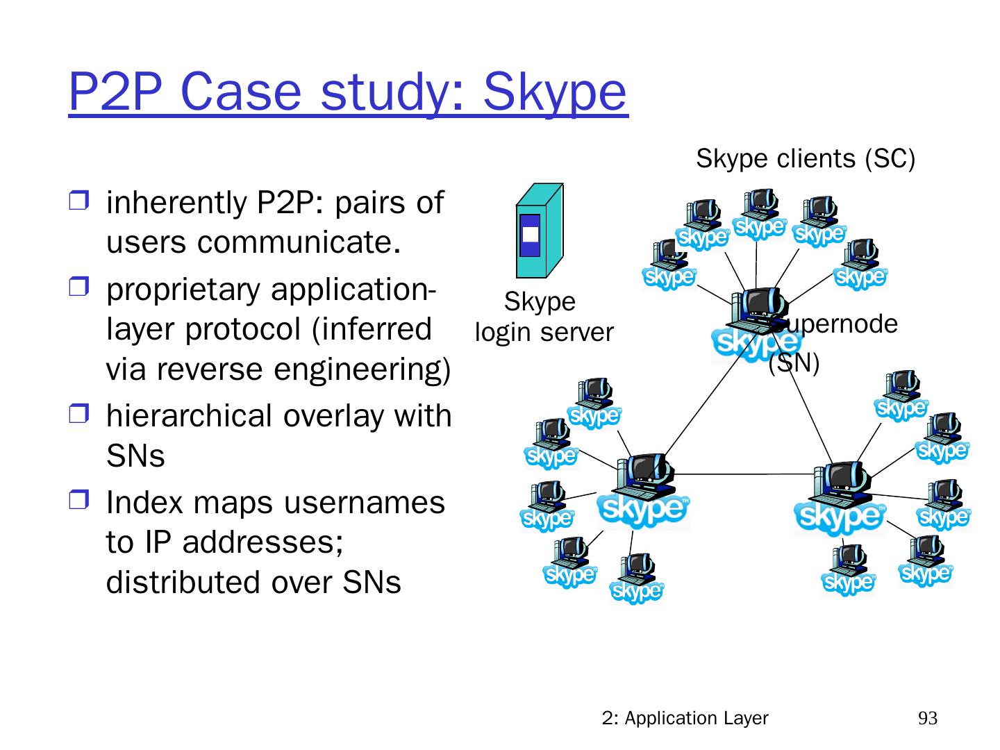 12 .2: Application Layer 12 Hybrid of client-server and P2P Skype voice-over-IP P2P application centralized server: finding address of remote party: client-client connection: direct (not through server) Instant messaging chatting between two users is P2P centralized service: client presence detection/location user registers its IP address with central server when it comes online user contacts central server to find IP addresses of buddies