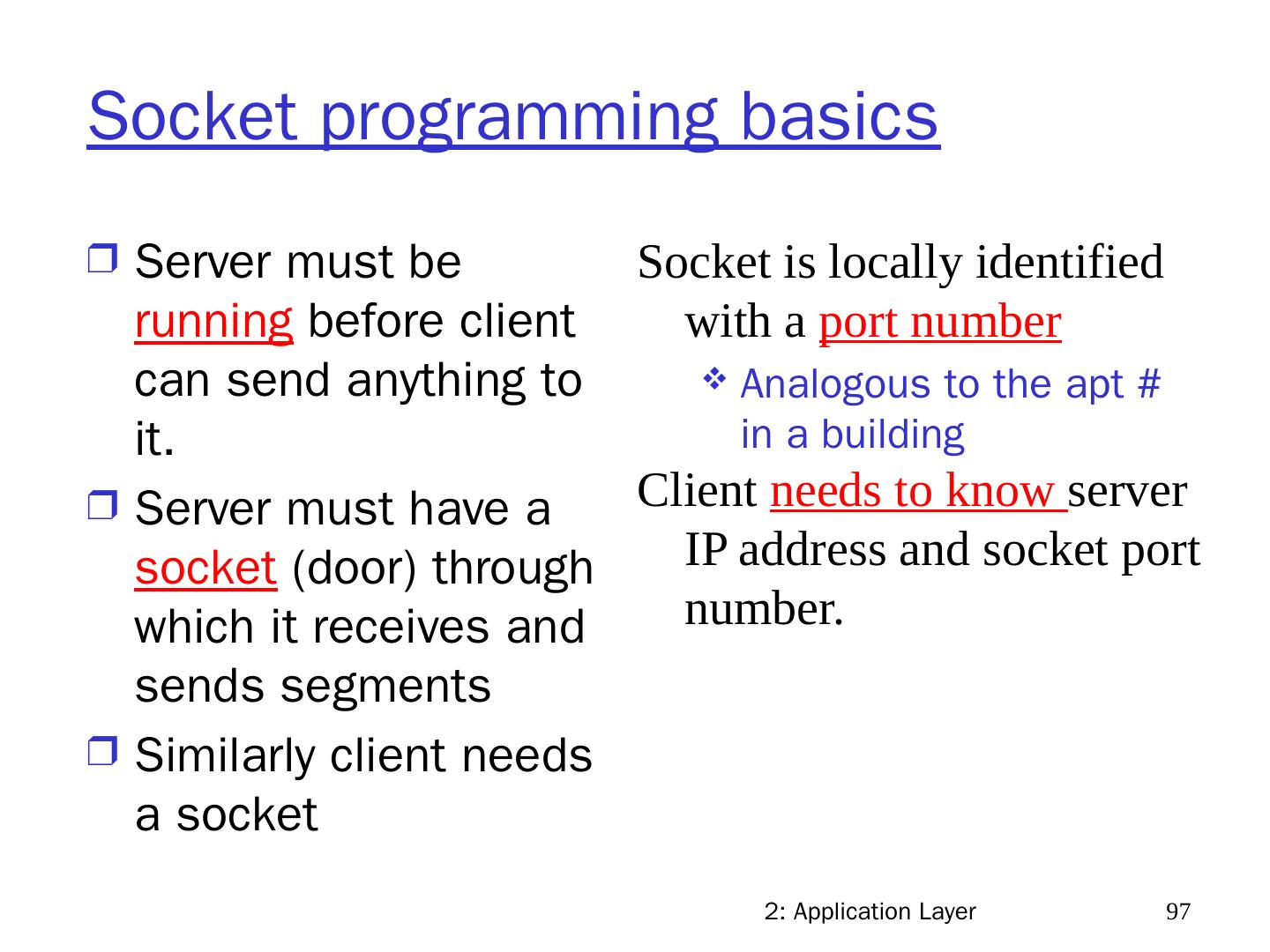 15 .2: Application Layer 15 Addressing processes to receive messages, process must have identifier host device has unique 32-bit IP address Exercise: use ipconfig from command prompt to get your IP address (Windows ) Q: does IP address of host on which process runs suffice for identifying the process? A: No, many processes can be running on same I dentifier includes both IP address and port numbers associated with process on host. Example port numbers: HTTP server: 80 Mail server: 25
