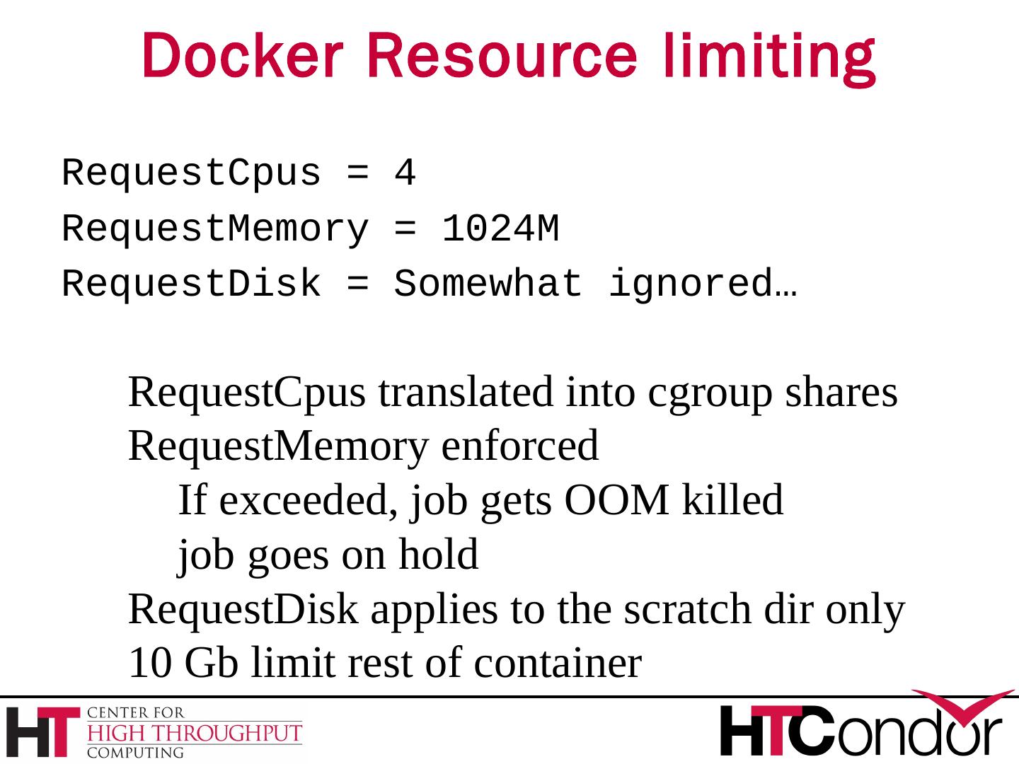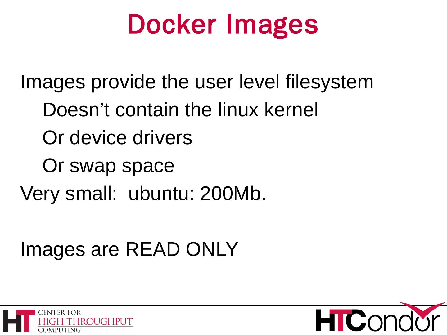 Container states: like a condor job: Running. Stopped. Docker Images. Images provide the user level filesystem. Doesn't contain the linux kernel. Or device ...
