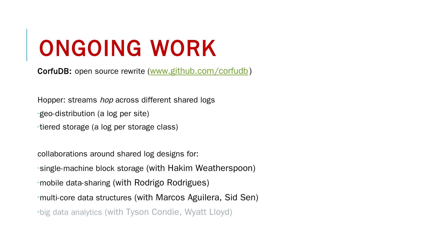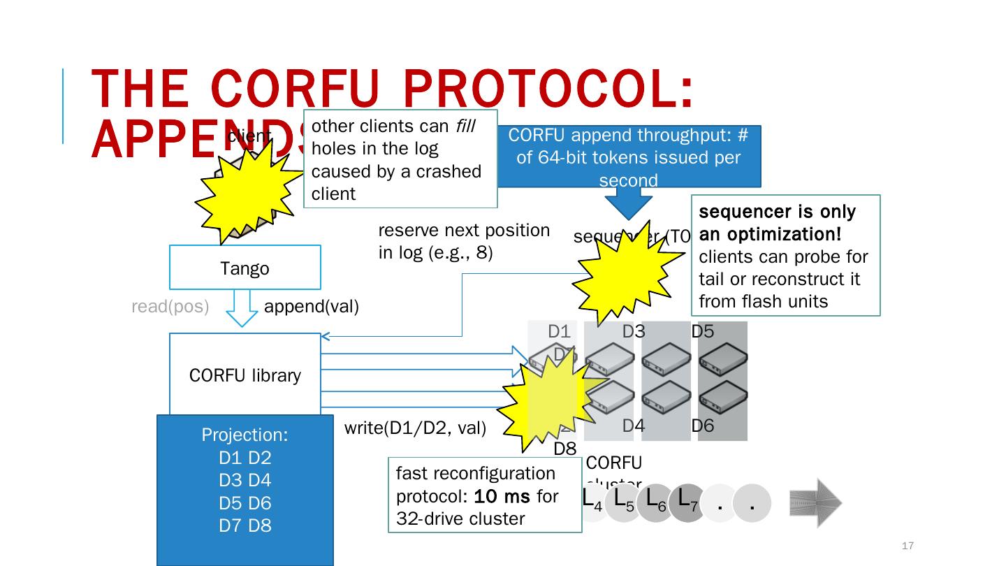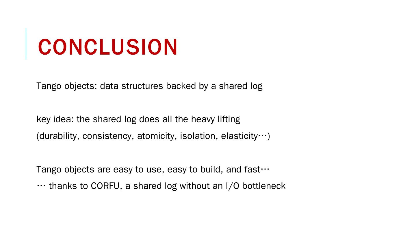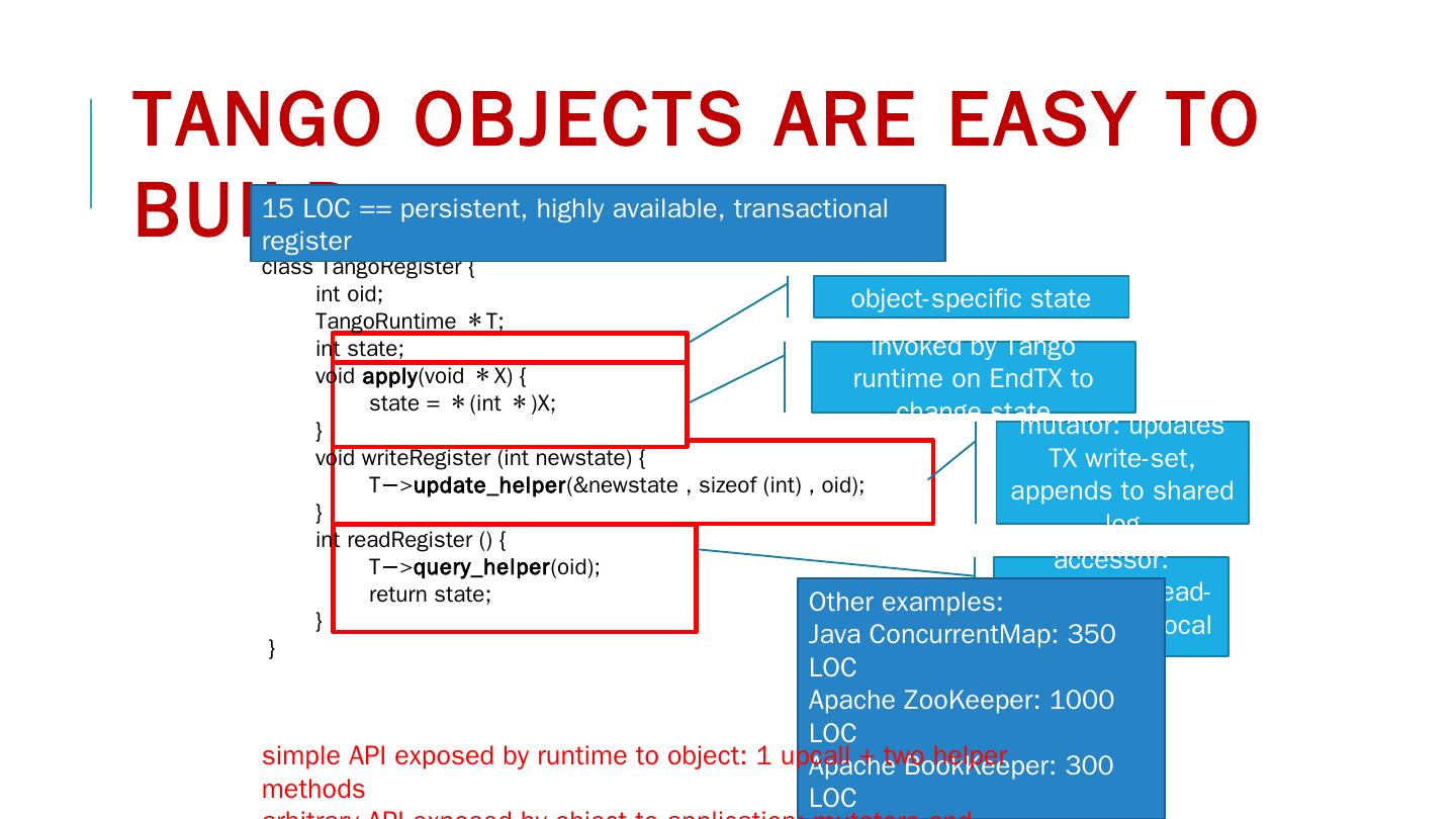 Java ConcurrentMap: 350 LOC. Apache ZooKeeper: 1000 LOC. Apache BookKeeper: 300 LOC. simple API exposed by runtime to object: 1 upcall + two helper ...