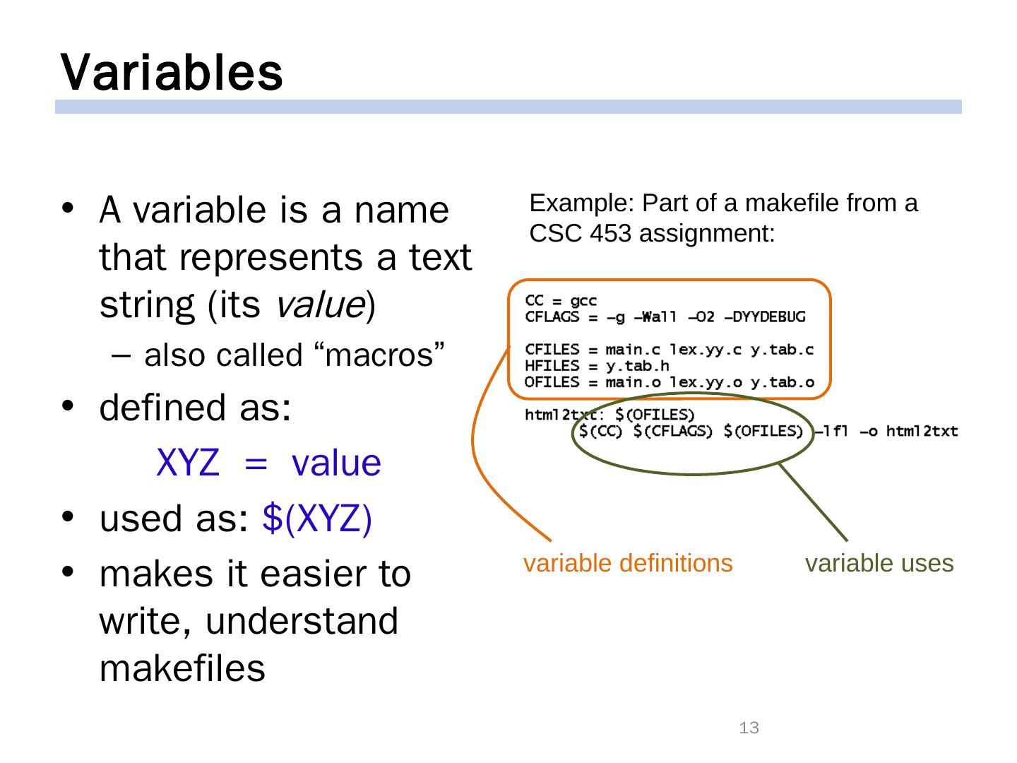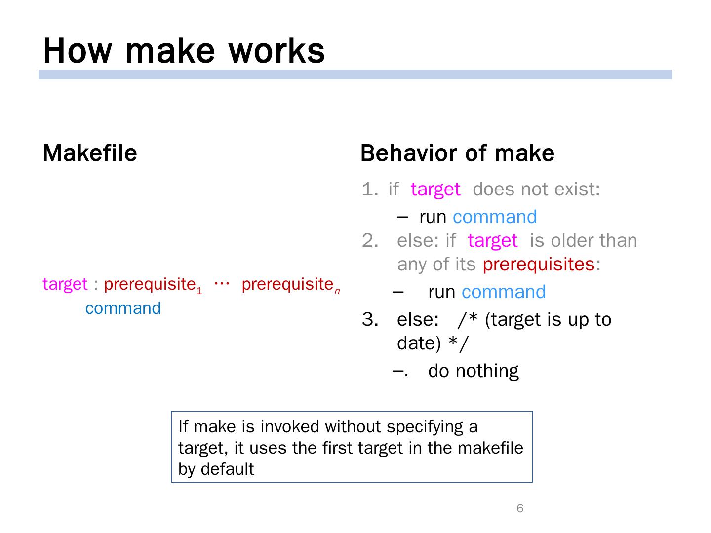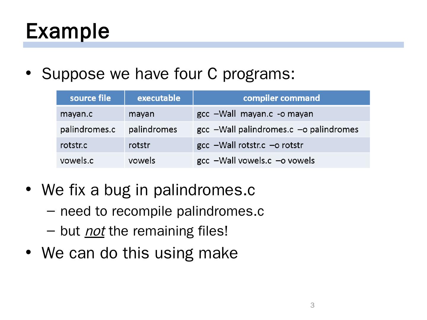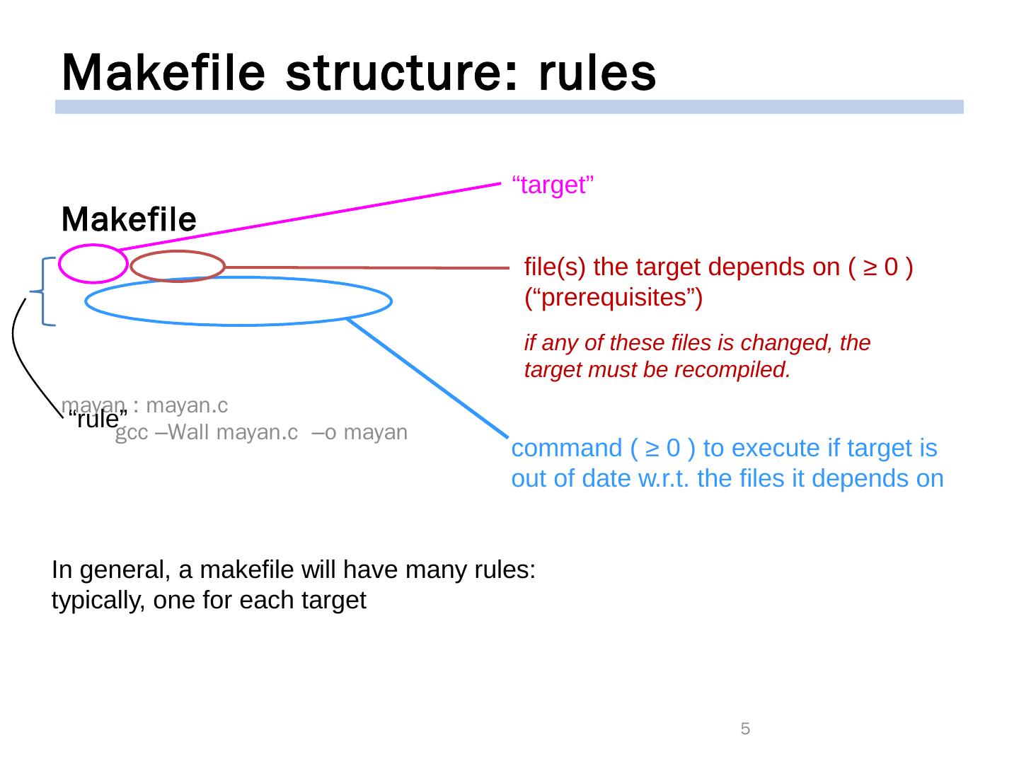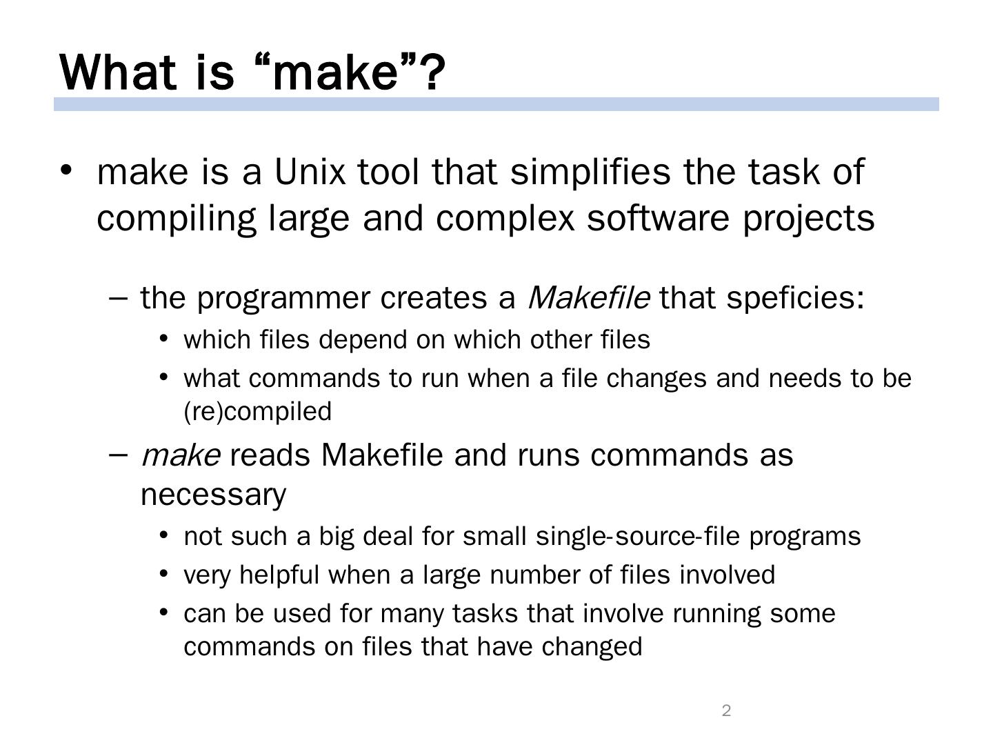 What is “make”? make is a Unix tool that simplifies the task of compiling large and complex software projects. the programmer creates a Makefile that speficies:.