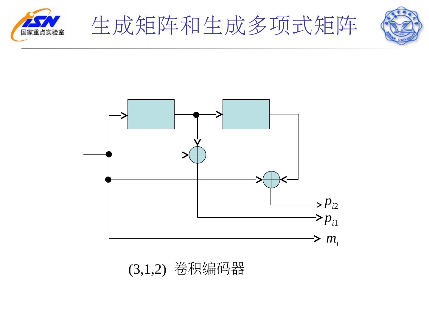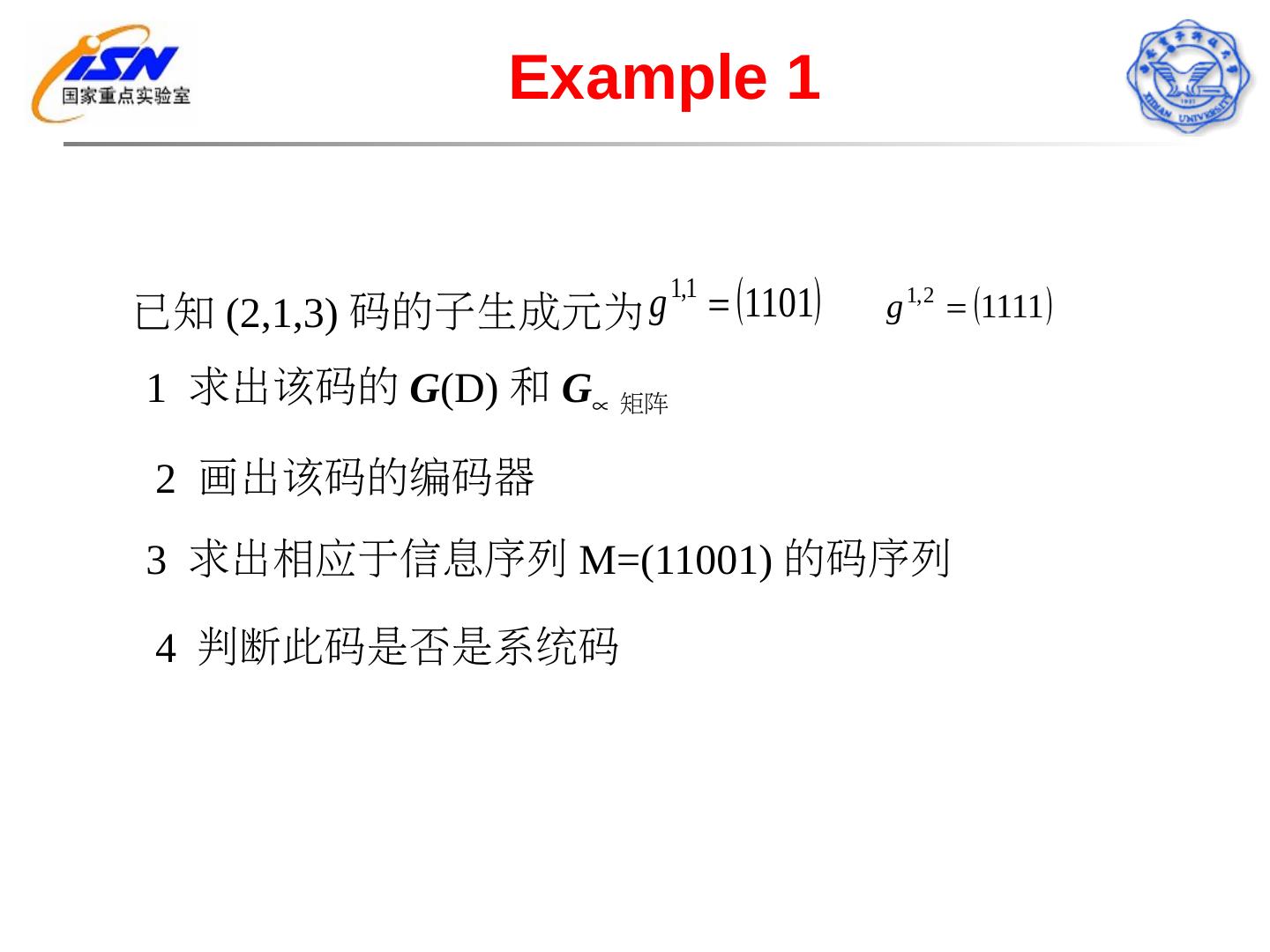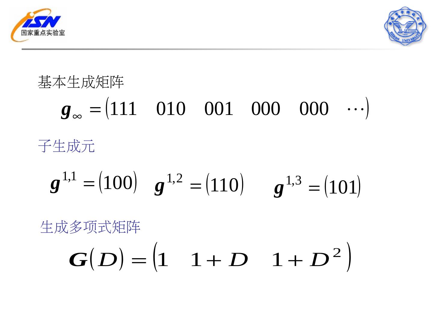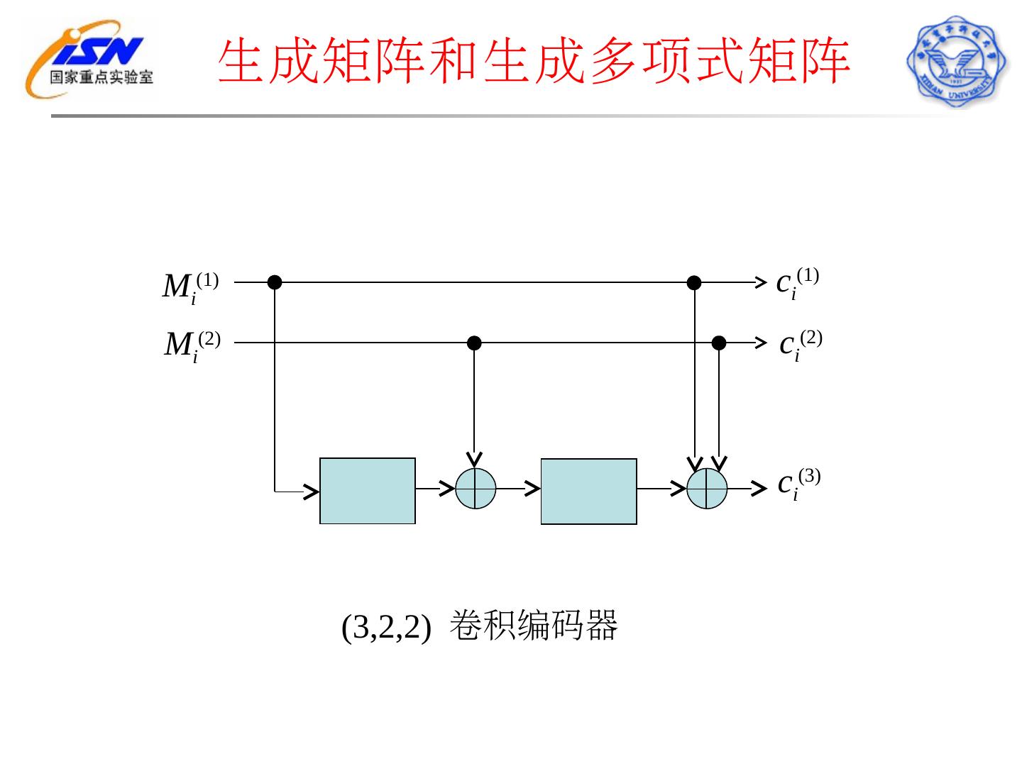 生成矩阵和生成多项式矩阵. Mi(1). Mi(2). ci(2). ci(1). ci(3). (3,2,2) 卷积编码器. Example 1. 已知(2,1,3)码的子生成元为. 1 求出该码的G(D)和G 矩阵.