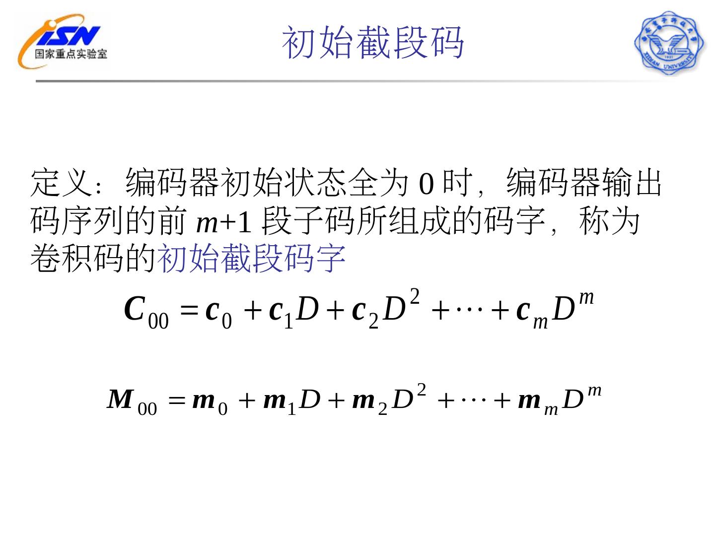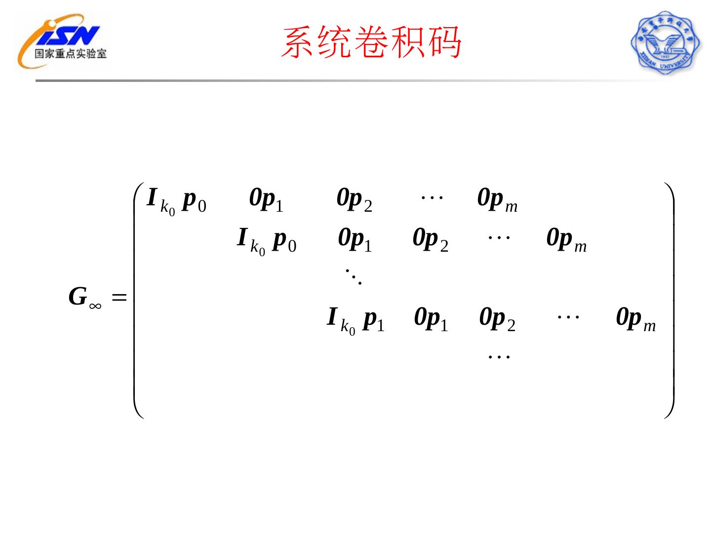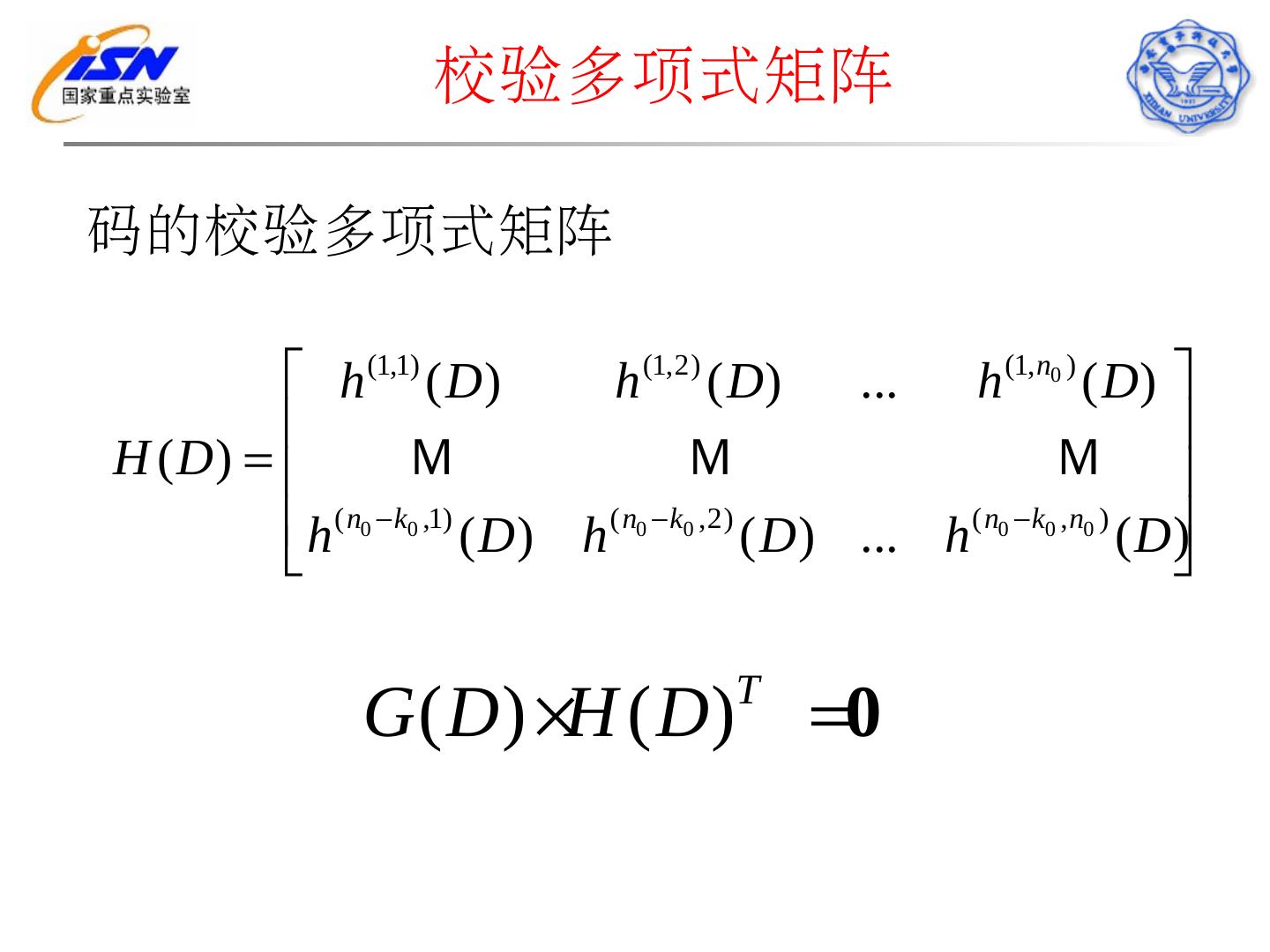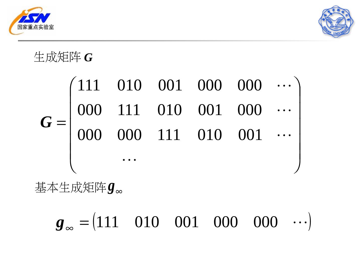 生成矩阵和生成多项式矩阵. Mi(1). Mi(2). ci(2). ci(1). ci(3). (3,2,2) 卷积编码器. Example 1. 已知(2,1,3)码的子生成元为. 1 求出该码的G(D)和G 矩阵.