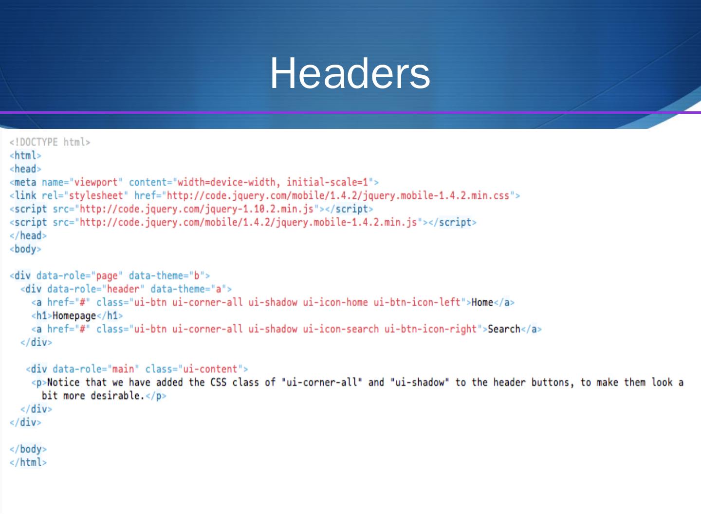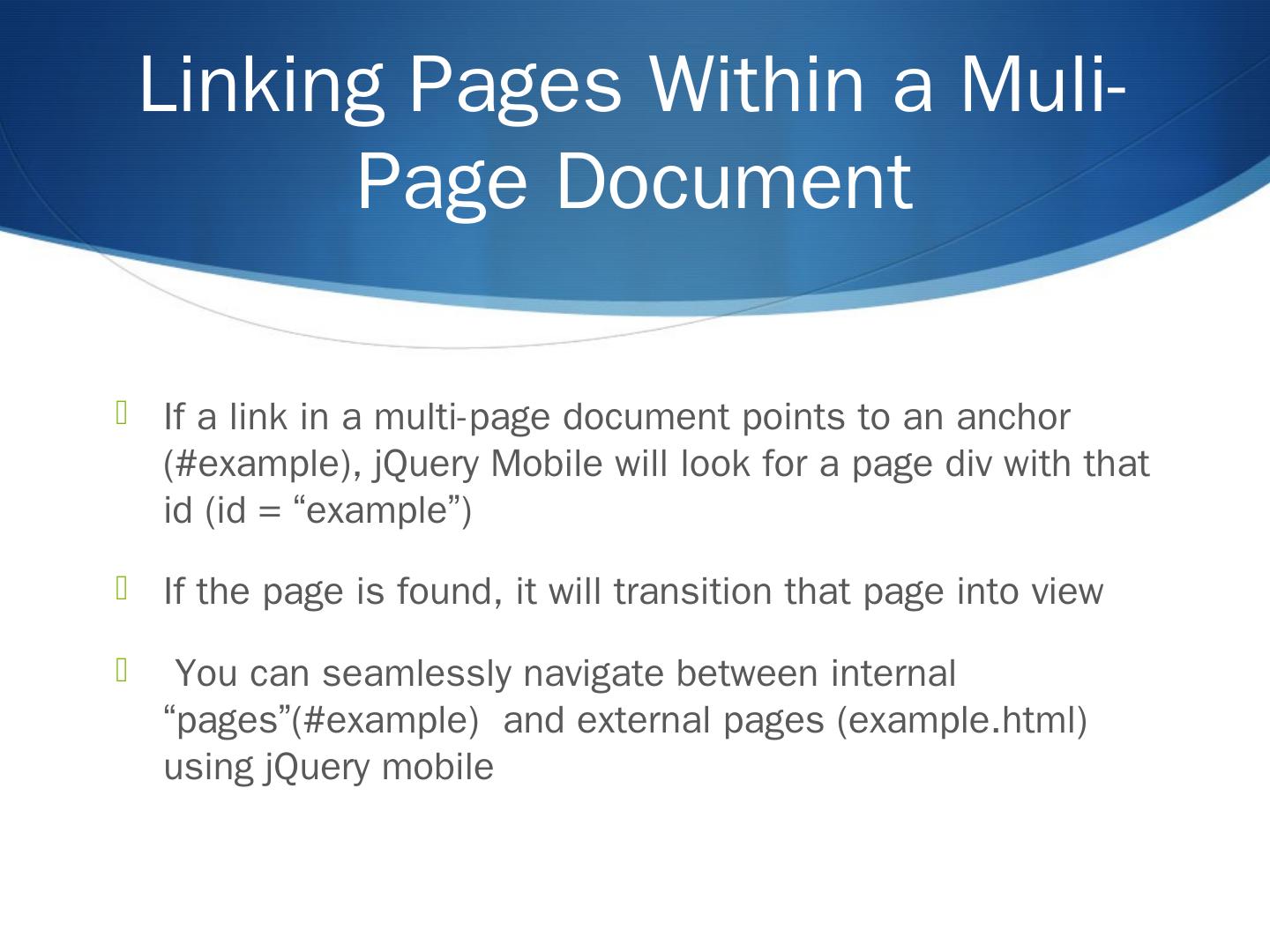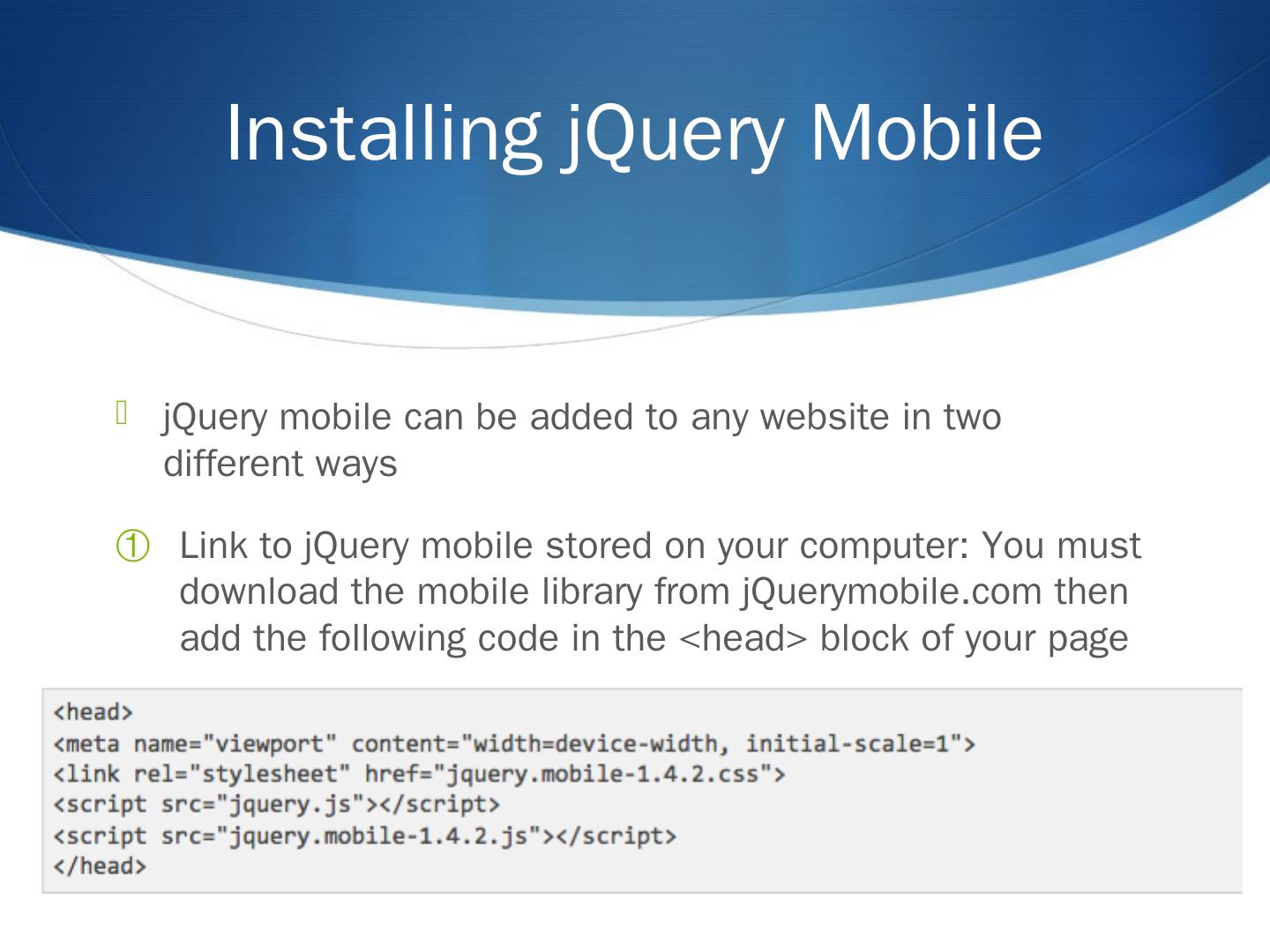 jQuery Mobile. An Introduction. What is jQuery Mobile. A framework built on top of jQuery, used for creating mobile web applications; Designed to make ...