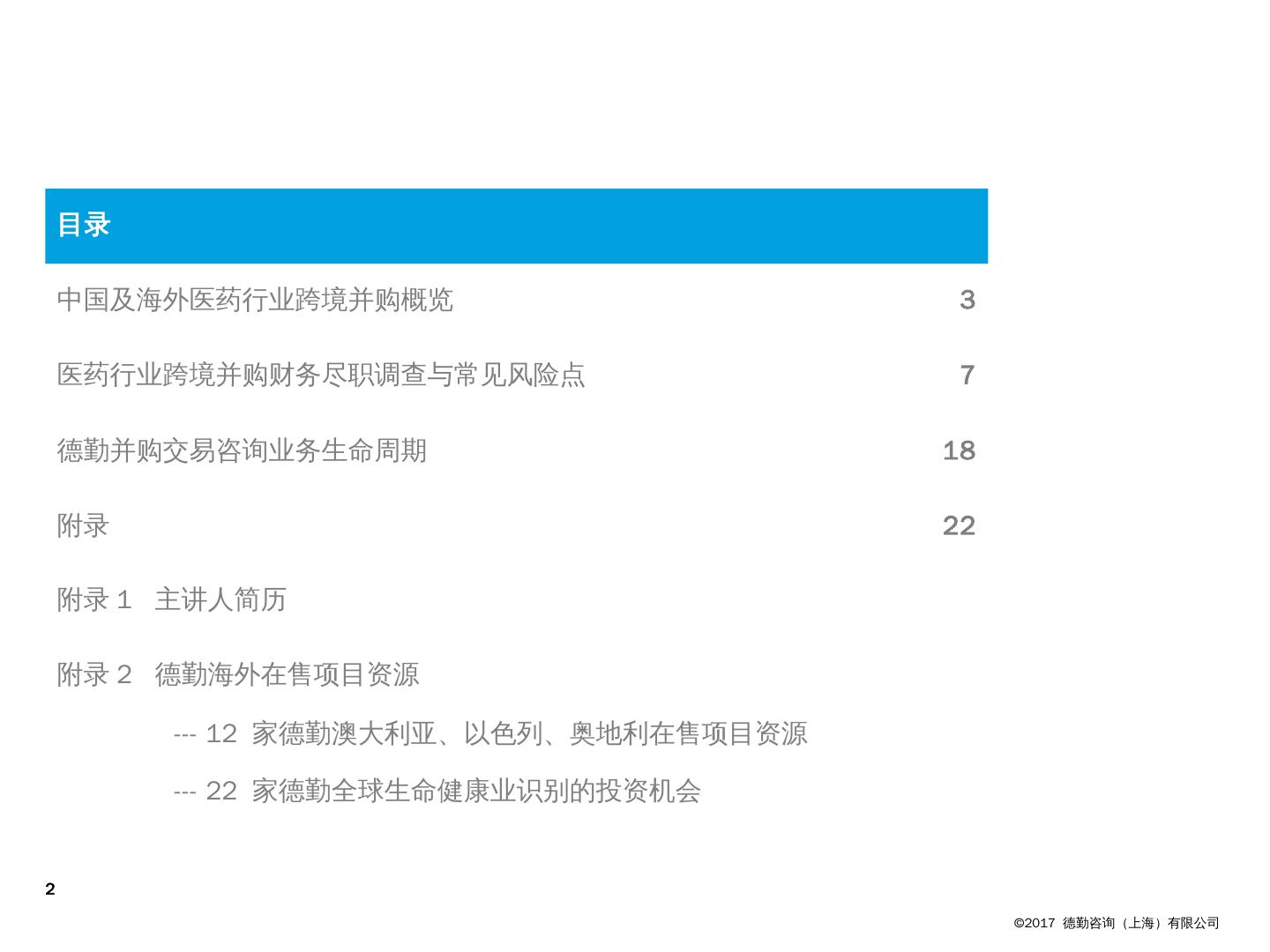 8 .陈播耘 德勤并购交易服务总监 德勤中国生命科学和健康服务行业财务咨询主管 总监 陈播耘先生现任德勤中国生命医药和健康服务行业财务咨询主管总监。他在审计、尽职调查及其他财务咨询服务等领域有 14 年的工作经验,专长于收购兼并交易相关的财务尽职调查、收购价值建议、并购谈判支持等领域,并已为超过 100 宗国内并购案和 40 宗跨境并购案提供建议。 陈先生为德勤全球生命医药和健康服务行业并购专业团队中国负责人,陈先生对生命科学及医疗行业有深入的专业经验和见解。他负责德勤全球并购团队中国和香港地区的路演、标的公司案源推介、旧金山 JP Morgan LSHC Conference 德勤专场的组织和演讲,致力于为中国企业和基金跨境并购建立起桥梁并成功完成收购。 陈先生曾在德勤美国纽约并购交易团队 2 年,在德勤美国完成近 20 件并购交易案。在纽约所任职期间,他主要从事中美跨国并购交易服务。 陈先生经常提供海外兼并收购相关的研讨会和峰会演讲,常任德勤 CFO 菁英计划演讲嘉宾。 陈先生毕业于上海交通大学,是经济金融专业及计算机专业双学士。陈先生持有美国注册会计师执照 (AICPA) ,亦是注册管理会计师协会 (CMA) 和国际内部审计师协会 (CIA) 会员。 联系方式: 电话: (86 21) 2316 6205 电子邮件: bobchen@deloitte.com.cn 附录 1 主讲人简历