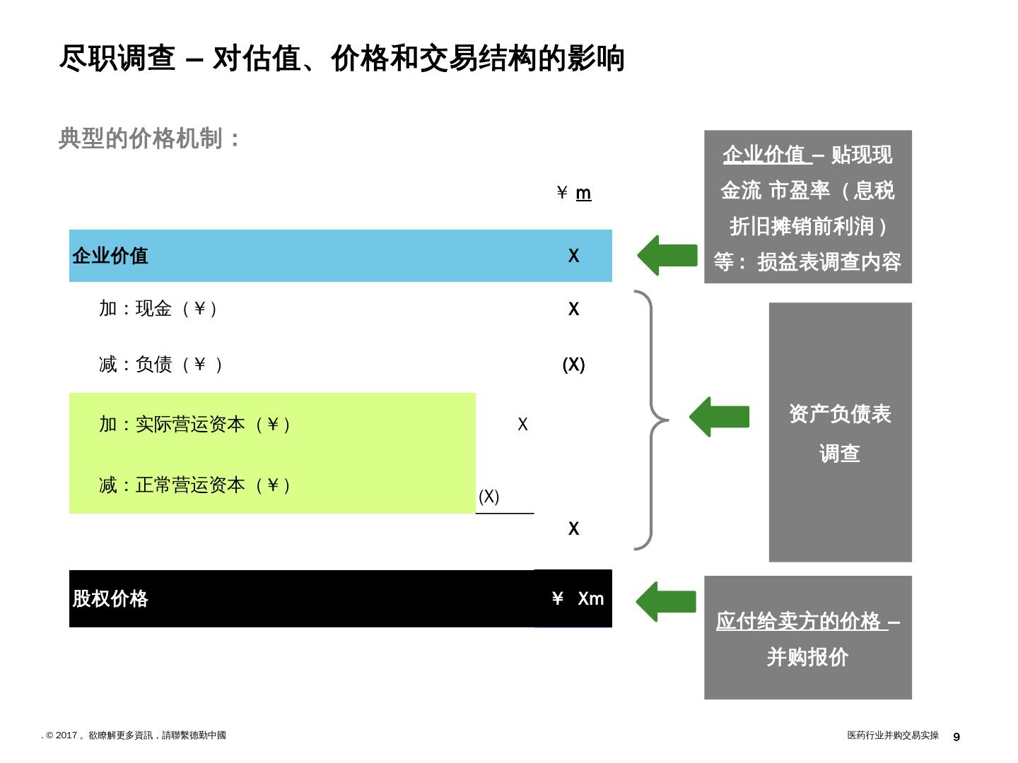4 .尽职调查 – 调查的目的、类别和范围 1. 并购战略发展 2. 目标挑选及确定 3. 初步尽职调查 4. 估值及协 同效益、价 值驱动因素 的量化 5. 意向书的谈判 6. 尽职调查 8. 执行 及准备交割 9. 推行并购后整合方案及运营计划 7. 交易谈判 执行计 划 尽职调查目的 尽职调查类别 财务尽职调查范围 内控和信息系统尽职调查 环境尽职调查 保险尽职调查 人力资源尽职调查 卖方尽职调查 协助最终条款的确定(声明与保证) 发现经营中的主要问题 / 评估计划的协同因素 整合计划 / 交易后续管理 风险管理 健全的公司治理及合规性 负债和未入账负债 或有负债和承诺 业务分立和剥离 关联方交易 内部控制及会计系统 营运资金及现金流 财务预测 公司背景 财务报表 盈利能力 资产质量 财务尽职调查 税务尽职调查 技术尽职调查 法律尽职调查 商业尽职调查 发现潜在的“交易破裂因素” 减低未能预见之财务风险 提供谈判筹码 定价支持 / 调整 便于改善交易结构 8