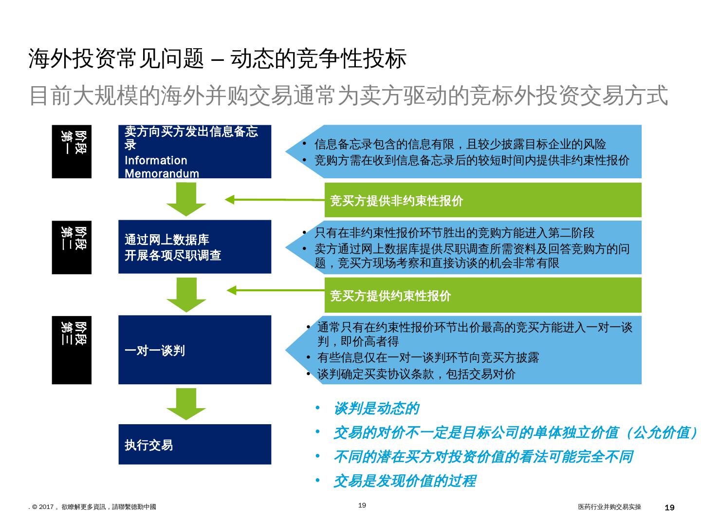 5 .卖方向买方发出信息备忘录 Information Memorandum 通过网上数据库 开展各项尽职调查 一对一谈判 执行交易 信息备忘录包含的信息有限,且较少披露目标企业的风险 竞购方需在收到信息备忘录后的较短时间内提供非约束性报价 只有在非约束性报价环节胜出的竞购方能进入第二阶段 卖方通过网上数据库提供尽职调查所需资料及回答竞购方的问题,竞买方现场考察和直接访谈的机会非常有限 通常只有在约束性报价环节出价最高的竞买方能进入一对一谈判,即价高者得 有些信息仅在一对一谈判环节向竞买方披露 谈判确定买卖协议条款,包括交易对价 阶段 第一 竞买方提供非约束性报价 竞买方提供约束性报价 阶段 第二 阶段 第三 目前大规模的海外并购交易通常为卖方驱动的竞标外投资交易方式 海外投资常见问题 – 动态的竞争性投标 谈判是动态的 交易的对价不一定是目标公司的单体独立价值(公允价值) 不同的潜在买方对投资价值的看法可能完全不同 交易是发现价值的过程