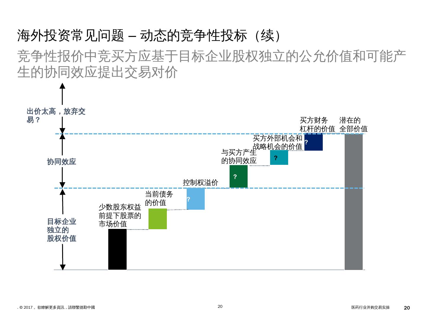 6 .? ? ? 少数股东权益 前提下股票的 市场价值 控制权溢价 与买方产生 的协同效应 买方外部机会和 战略机会的价值 ? 买方财务 杠杆的价值 当前债务 的价值 潜在的 全部价值 目标企业独立的 股权价值 协同效应 出价太高,放弃交易? 竞争性报价中竞买方应基于目标企业股权独立的公允价值和可能产生的协同效应提出交易对价 海外投资常见问题 – 动态的竞争性投标(续)
