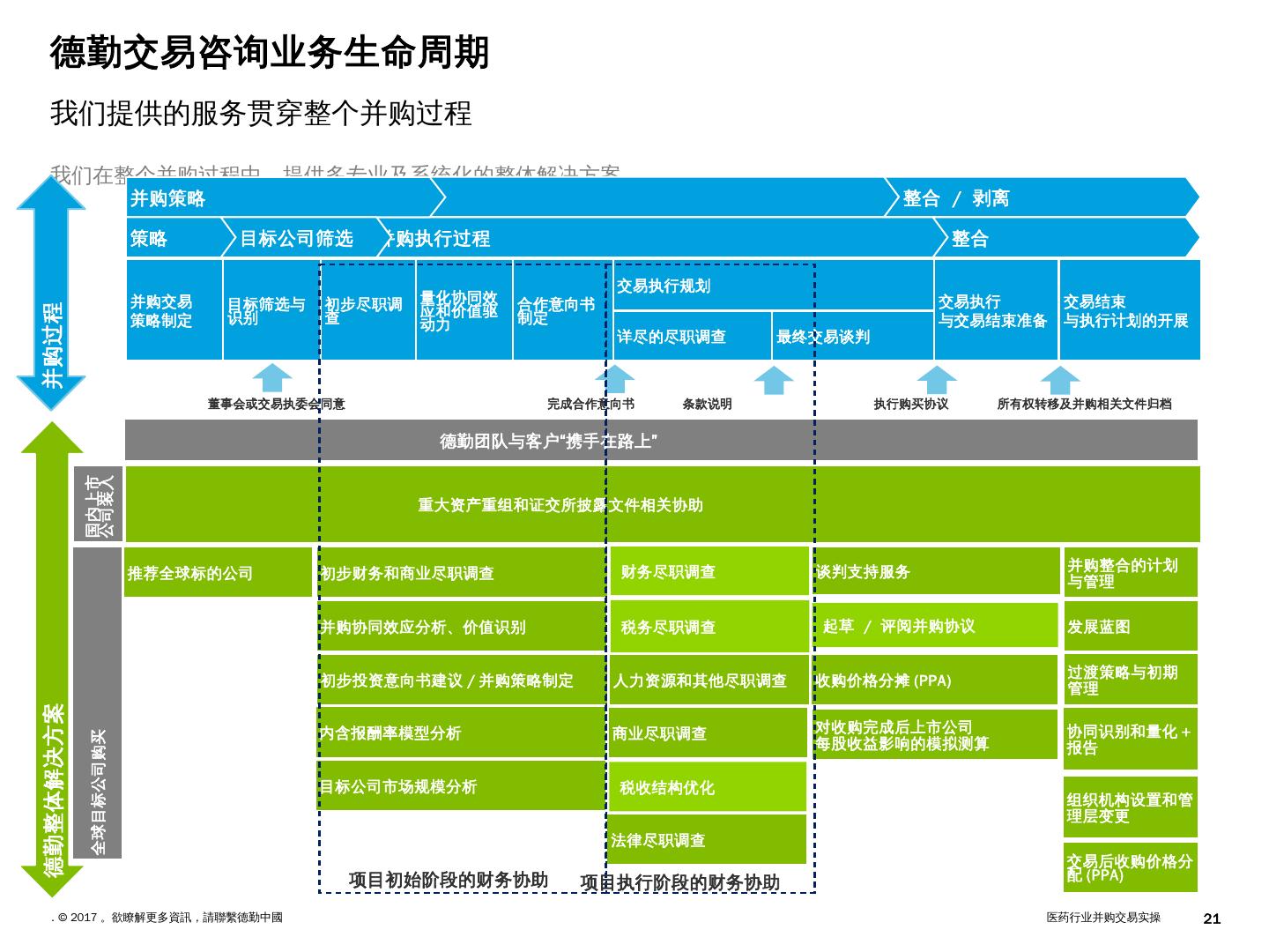 7 .我们提供的服务贯穿整个并购过程 我们在整个并购过程中,提供多专业及系统化的整体解决方案 交易执行 与交易结束准备 交易结束 与执行计划的开展 并购执行过程 整合 尽职调查 整合 / 剥离 并购策略 完成合作意向书 执行购买协议 所有权转移及并购相关文件归档 德勤团队与客户“携手在路上” 并购交易 策略制定 目标筛选与识别 初步尽职调查 量化协同效应和价值驱动力 合作意向书制定 策略 目标公司筛选 董事会或交易执委会同意 交易执行规划 详尽的尽职调查 最终交易谈判 条款说明 并购过程 德勤整体解决方案 重大资产重组和证交所披露文件相关协助 国内上市公司装入 全球目标公司购买 组织机构设置和管理层变更 交易后收购价格分配 (PPA) 税收结构优化 法律尽职调查 谈判支持服务 并购整合的计划与管理 发展蓝图 过渡策略与初期管理 协同识别和量化 + 报告 推荐全球标的公司 初步财务和商业尽职调查 并购协同效应分析、价值识别 初步投资意向书建议 / 并购策略制定 财务尽职调查 税务尽职调查 人力资源和其他尽职调查 起草 / 评阅并购协议 收购价格分摊 (PPA) 商业尽职调查 内含报酬率模型分析 目标公司市场规模分析 对收购完成后上市公司 每股收益影响的模拟测算 项目初始阶段的财务协助 项目执行阶段的财务协助 德勤交易咨询业务生命周期