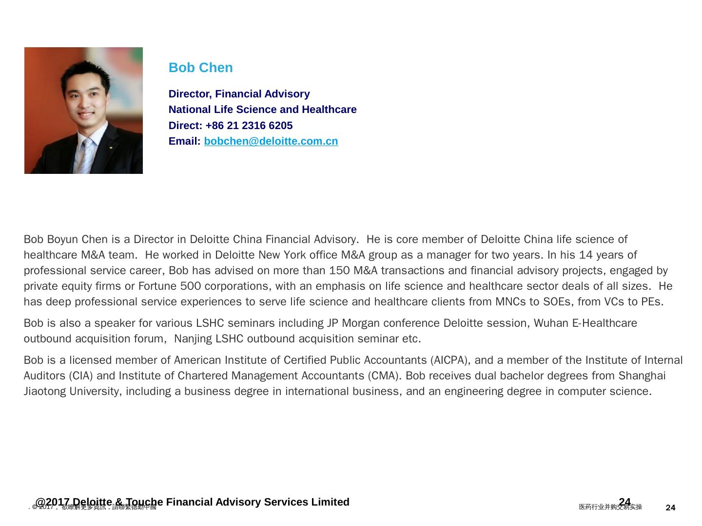 9 .Bob Boyun Chen is a Director in Deloitte China Financial Advisory. He is core member of Deloitte China life science of healthcare M&A team. He worked in Deloitte New York office M&A group as a manager for two years. In his 14 years of professional service career, Bob has advised on more than 150 M&A transactions and financial advisory projects, engaged by private equity firms or Fortune 500 corporations, with an emphasis on life science and healthcare sector deals of all sizes. He has deep professional service experiences to serve life science and healthcare clients from MNCs to SOEs, from VCs to PEs. Bob is also a speaker for various LSHC seminars including JP Morgan conference Deloitte session, Wuhan E-Healthcare outbound acquisition forum, Nanjing LSHC outbound acquisition seminar etc. Bob is a licensed member of American Institute of Certified Public Accountants (AICPA), and a member of the Institute of Internal Auditors (CIA) and Institute of Chartered Management Accountants (CMA). Bob receives dual bachelor degrees from Shanghai Jiaotong University, including a business degree in international business, and an engineering degree in computer science. @2017 Deloitte & Touche Financial Advisory Services Limited 24 Bob Chen Director, Financial Advisory National Life Science and Healthcare Direct: +86 21 2316 6205 Email: bobchen@deloitte.com.cn